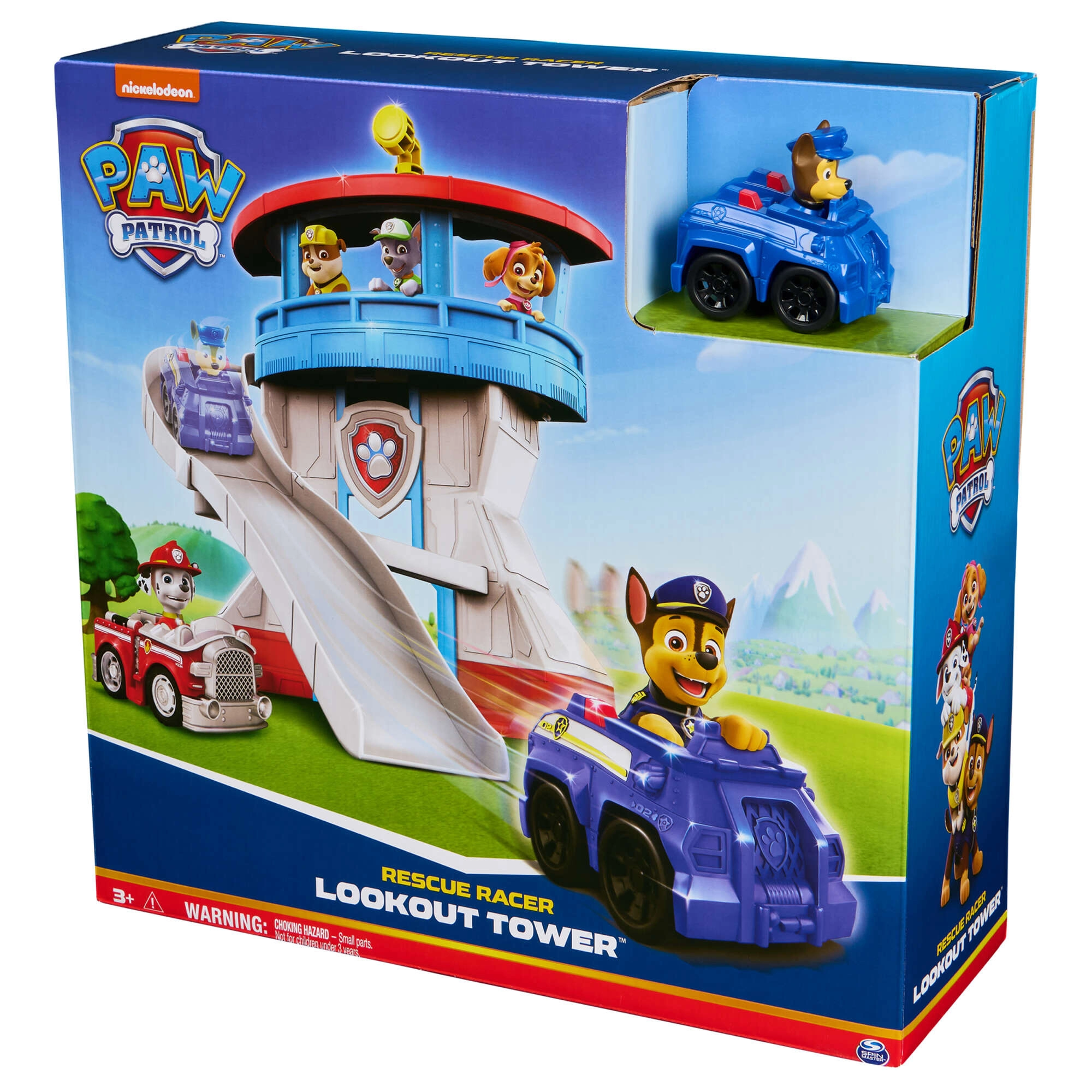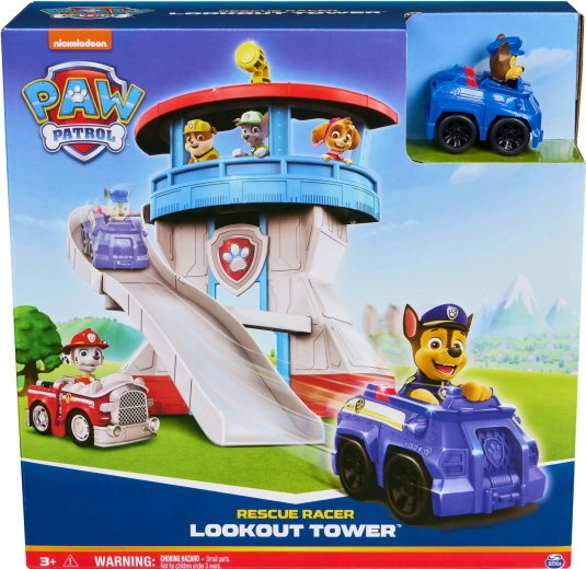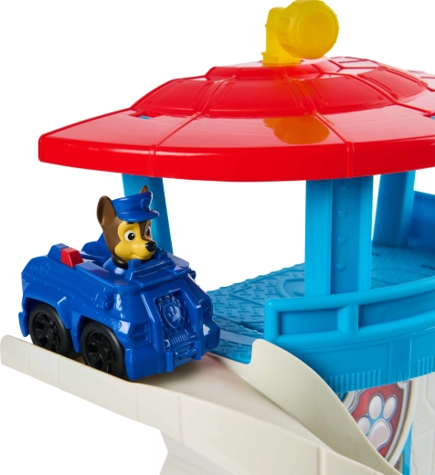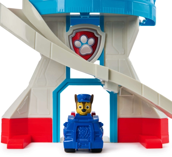 Ovaj šareni set za igru inspiriran serijom Paw Patrol nudi djeci realističnu bazu za njihove spasilačke scenarije. Kulu krasi ikonska pseća značka, a na vrhu se nalazi okretni žuti periskop kojim Chase može nadzirati okolicu. U kompletu je i kompaktni plavi autić s figurom Chasea – spreman za brzi spust niz zakrivljeni tobogan.