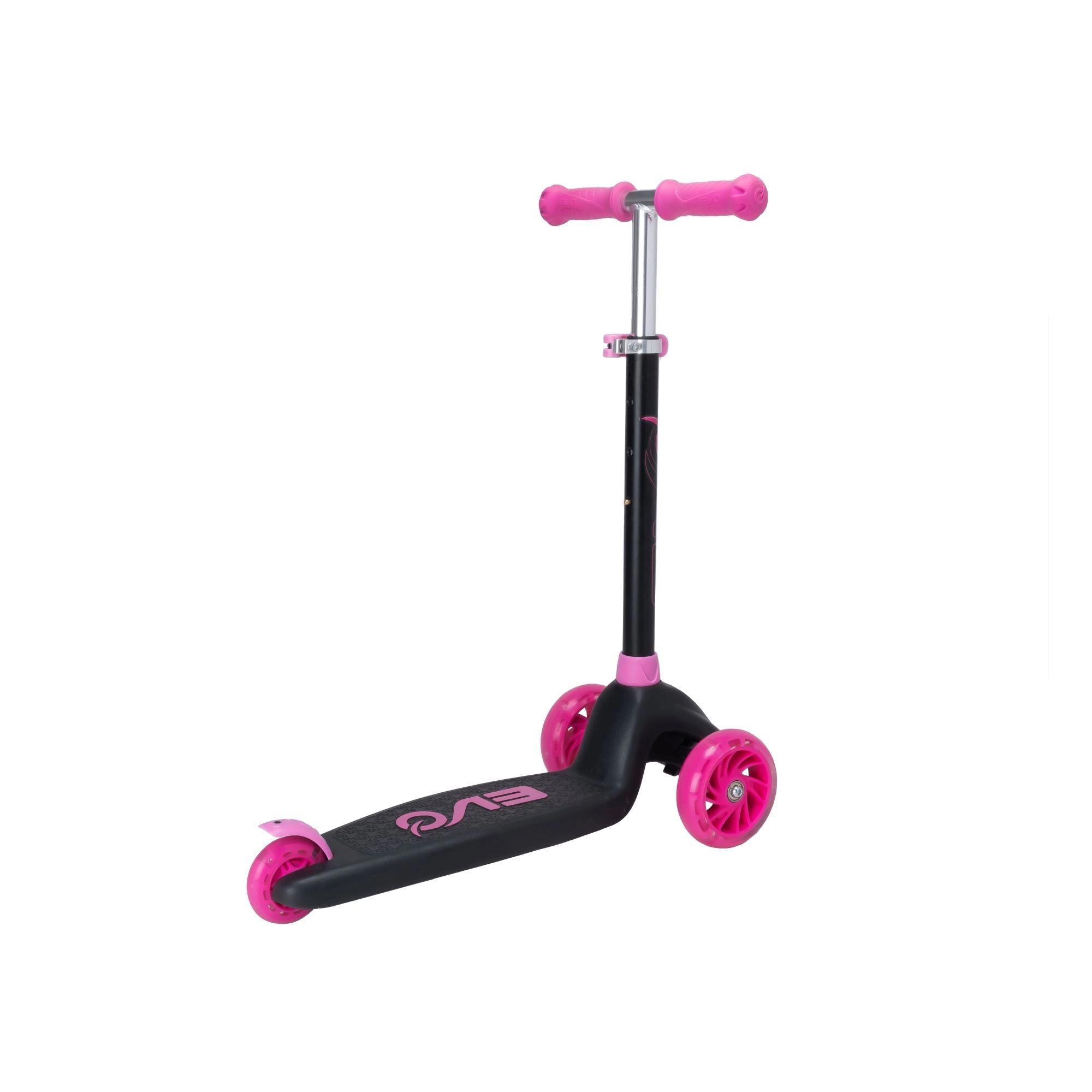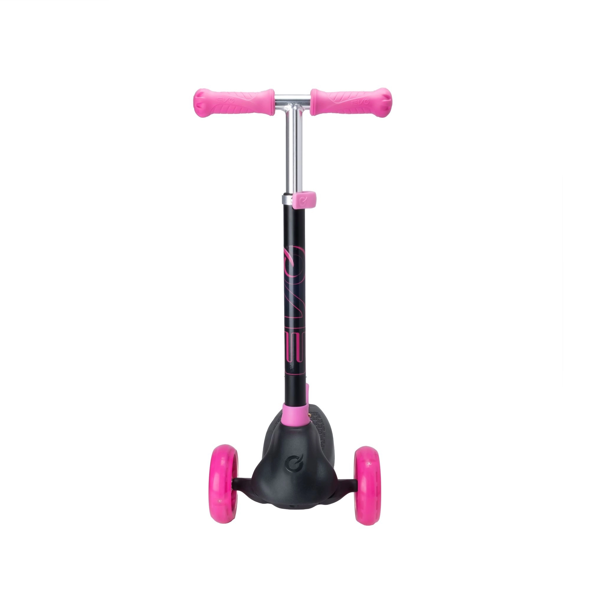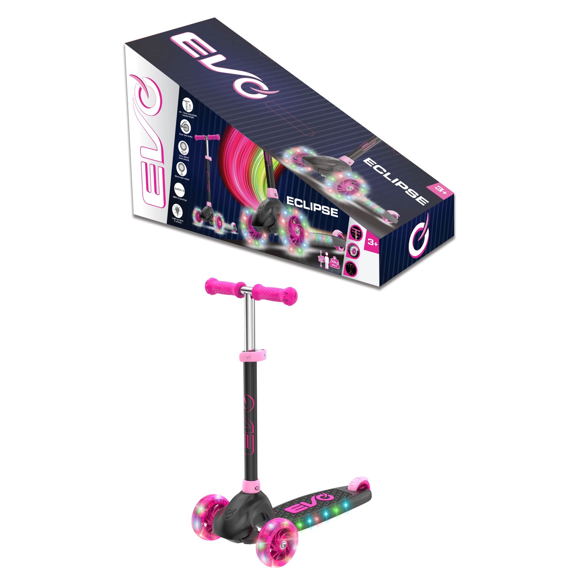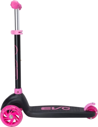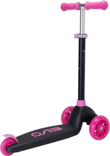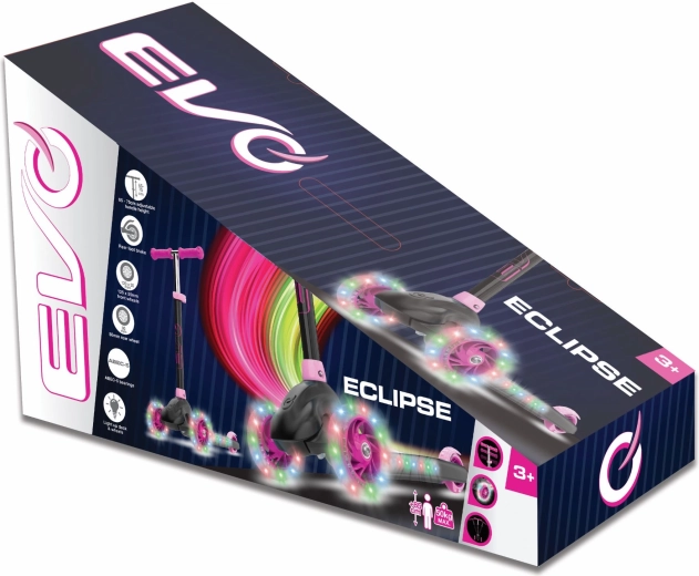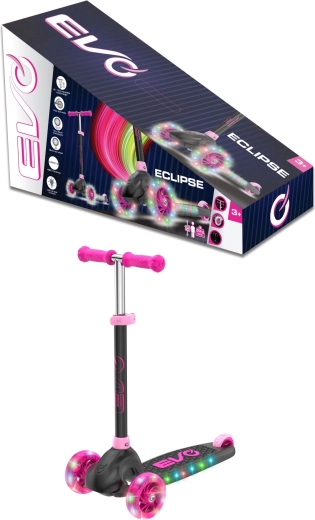 Zabavan i siguran trotinet na tri kotača za djecu od 3 godine. Model EVO Eclipse nudi stabilnu vožnju zahvaljujući dvama prednjim kotačima, podesiva upravljačka ručka raste s djetetom, a LED svjetleći kotači i podvozje povećavaju vidljivost i donose dodatnu radost u vožnji. Balansno upravljanje razvija koordinaciju, a nožna kočnica osigurava pouzdano zaustavljanje.