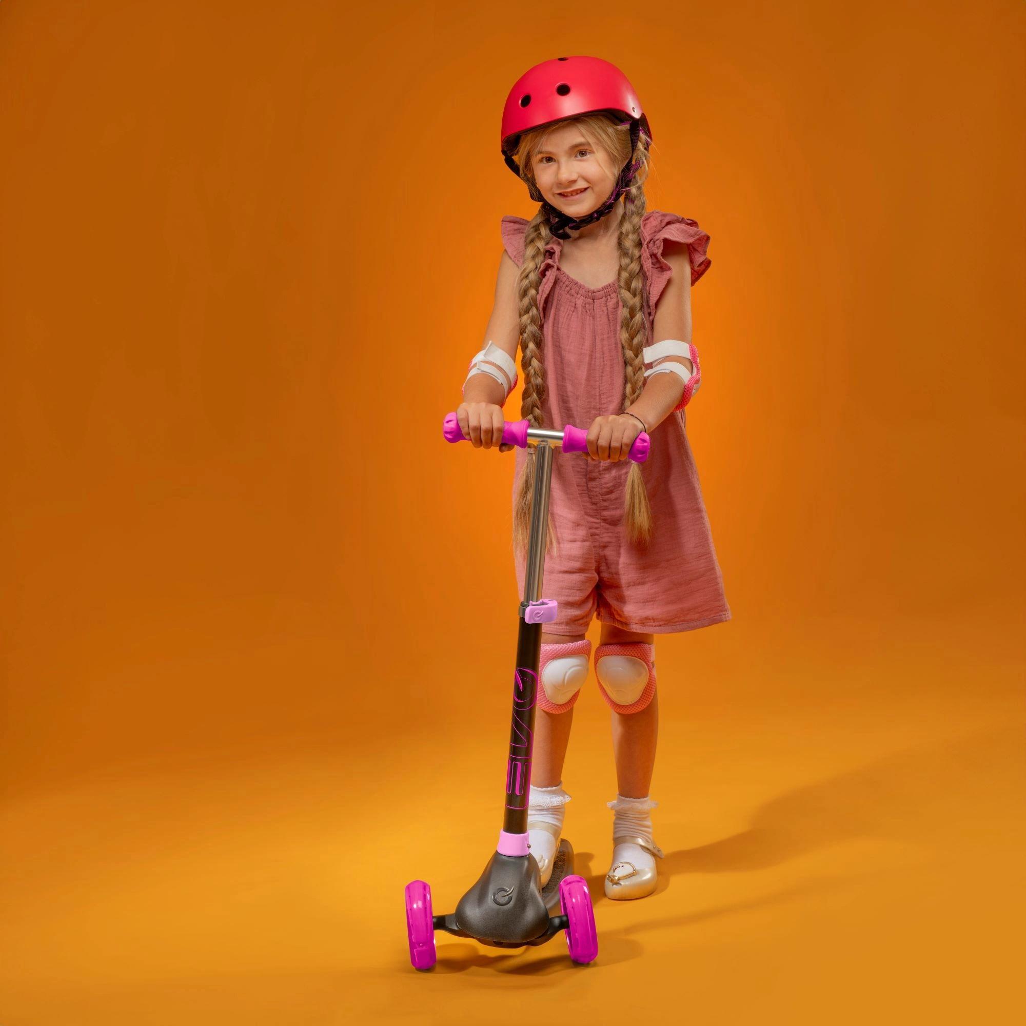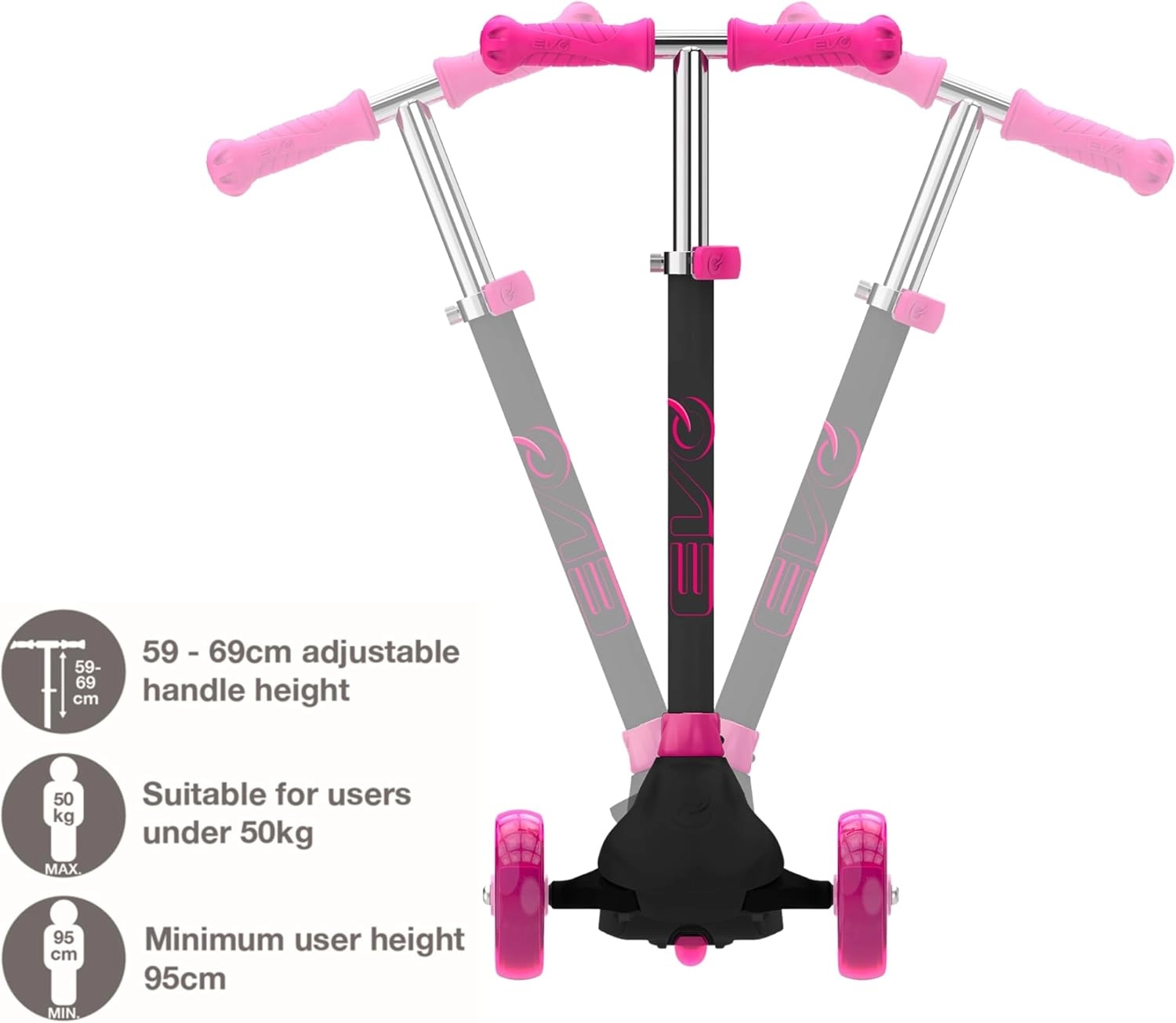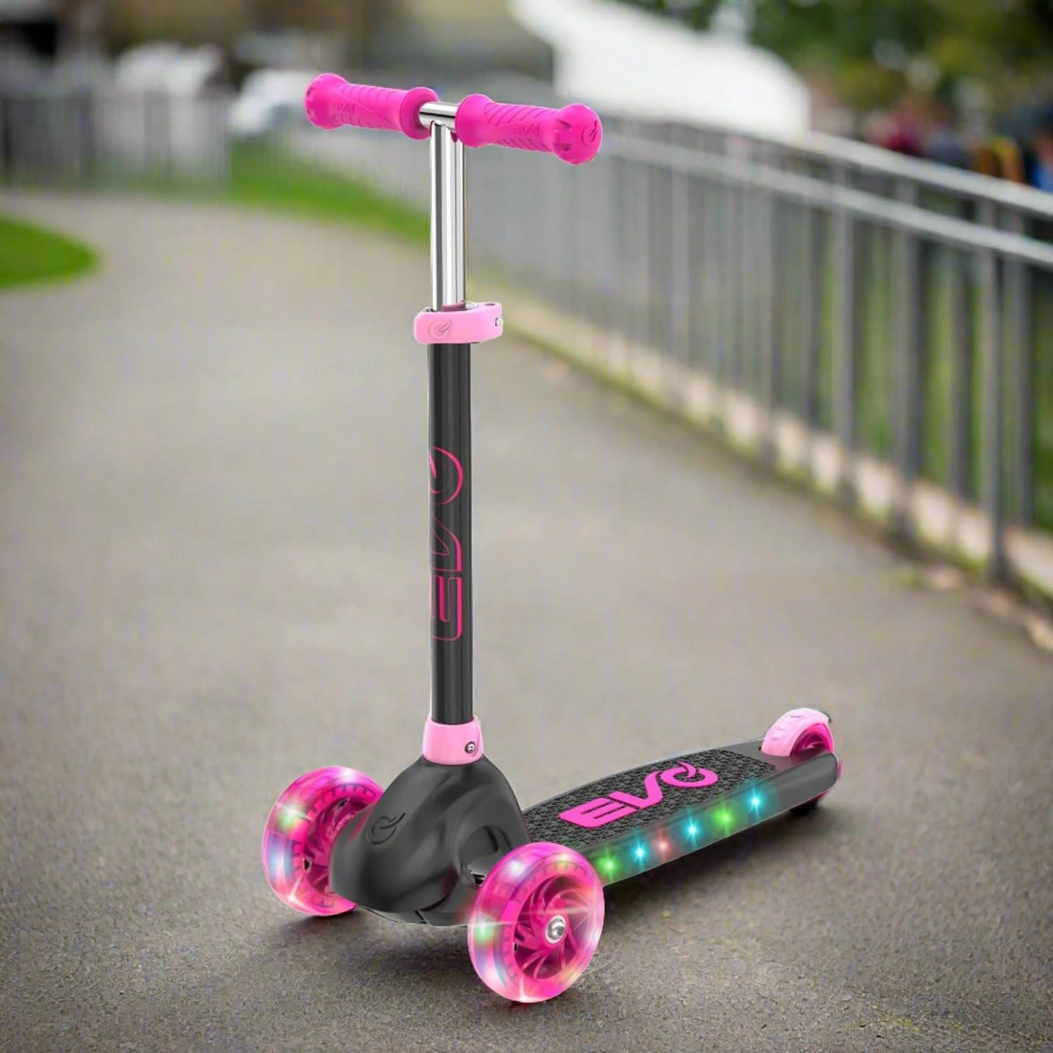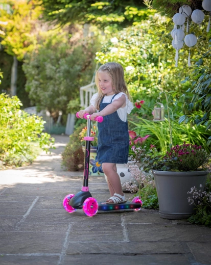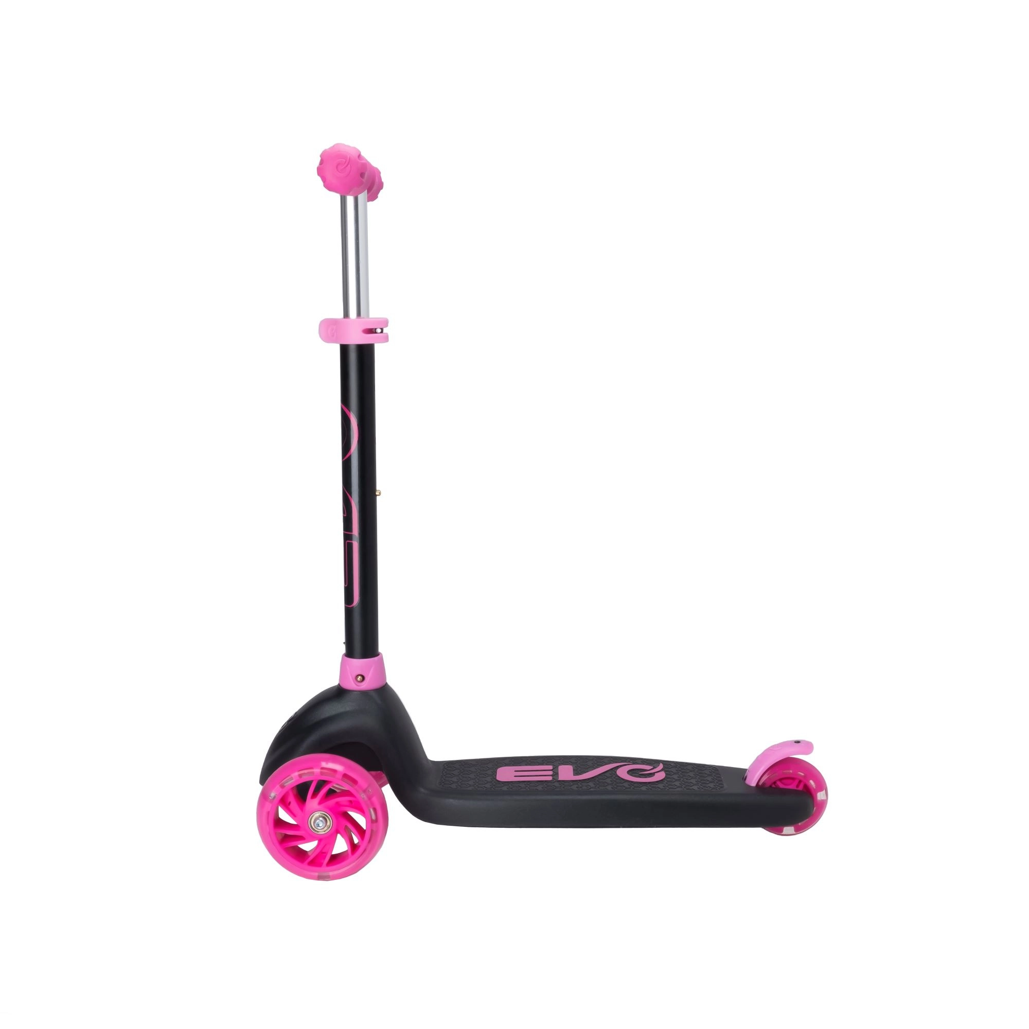 Zabavan i siguran trotinet na tri kotača za djecu od 3 godine. Model EVO Eclipse nudi stabilnu vožnju zahvaljujući dvama prednjim kotačima, podesiva upravljačka ručka raste s djetetom, a LED svjetleći kotači i podvozje povećavaju vidljivost i donose dodatnu radost u vožnji. Balansno upravljanje razvija koordinaciju, a nožna kočnica osigurava pouzdano zaustavljanje.