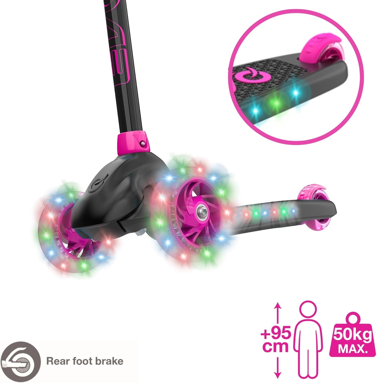 Šareni svjetlosni efekti povećavaju vidljivost i svaku vožnju čine atraktivnim doživljajem. Napajanje 3× AAA (nisu uključene).