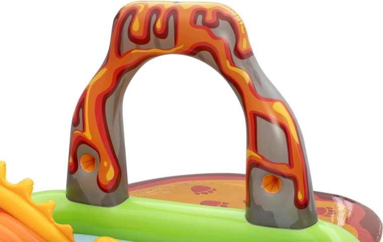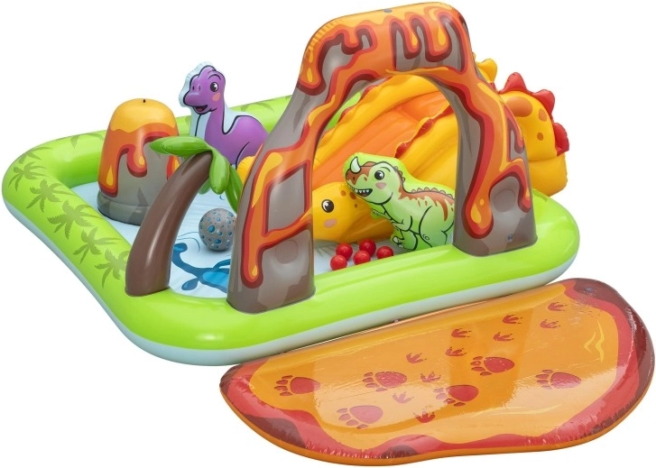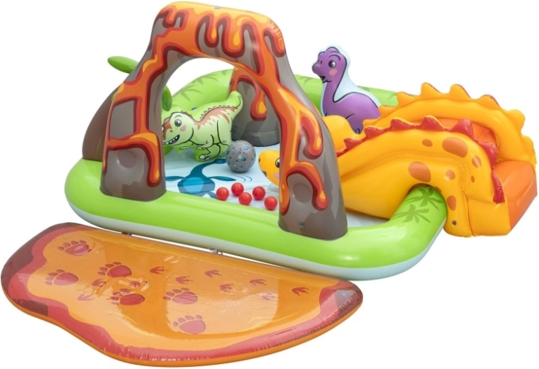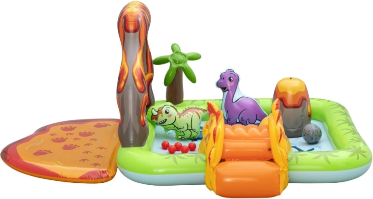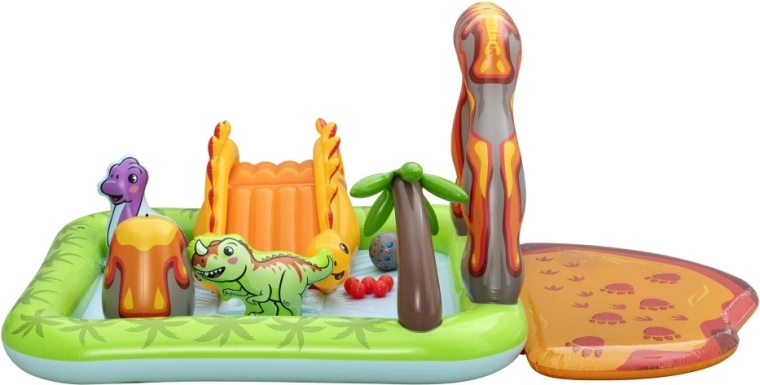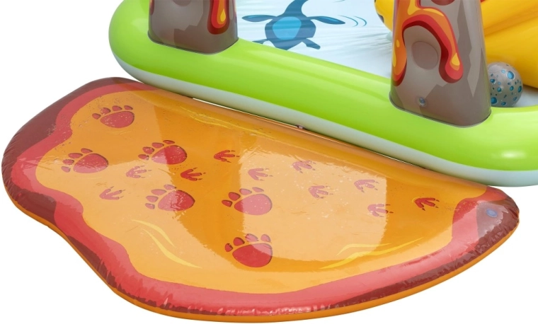 Dio centra je žuti dinosaur s toboganom, nafukavajući zeleni i ljubičasti dinosaur kao figure za igru, otvor u “vulkanu” za ubacivanje loptica te mekani pristajni jastučić za siguran doček. Zahvaljujući kvalitetnom vinilu, glatkim šavovima i zaobljenim rubovima, igra je udobna i sigurna. Brzo napuhavanje, lako ispuštanje zraka i priložena zakrpa olakšavaju održavanje i pohranu.