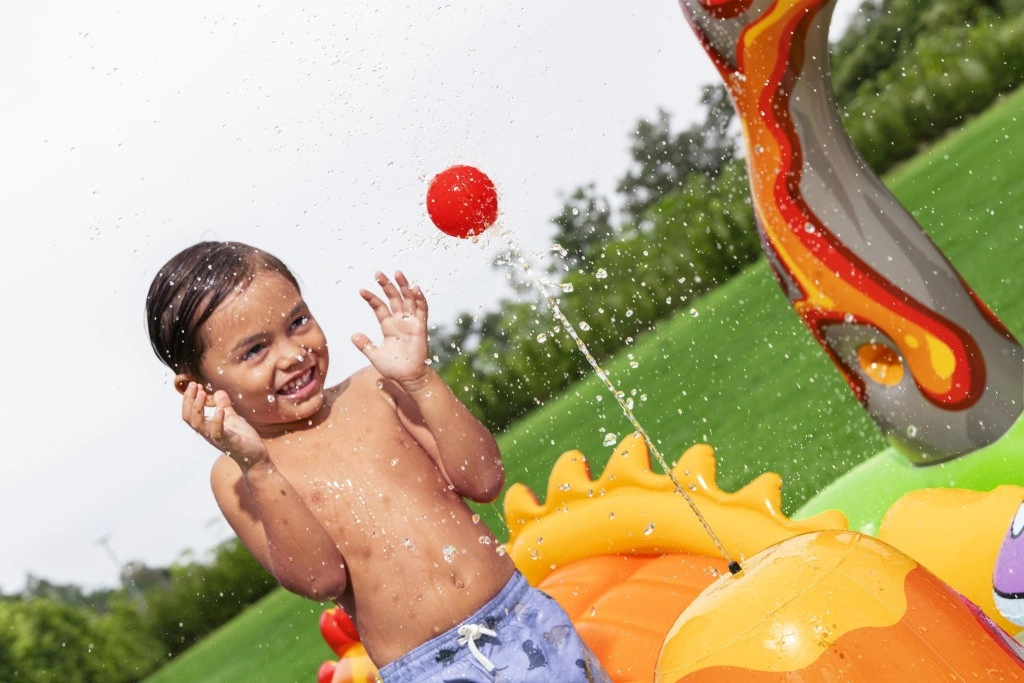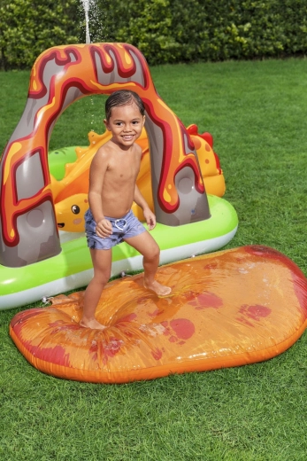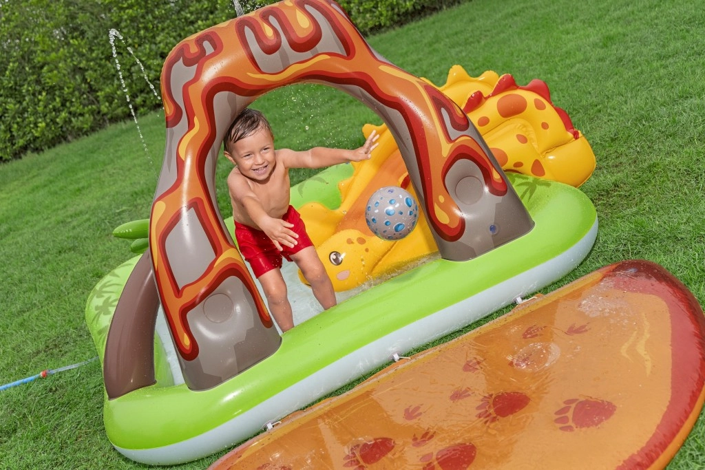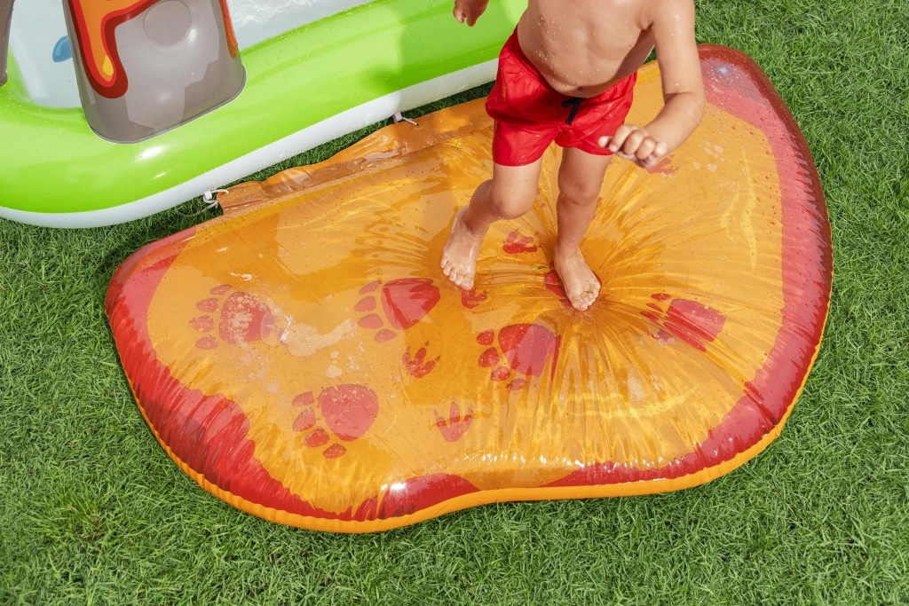 Nafukavajući igraći centar s dinosaurima idealan je izbor za aktivnu ljetnu zabavu djece od 2 godine. Zeleni bazen s otiskom palmi i plavim dnom prima oko 150 l vode, dok zasebna vodena podloga s motivom lave dodaje još 80 l za mekani doček i veselo gaženje. Integrirani raspršivač na vulkanskom luku jednostavno spojite na vrtnu cijev i u trenu stvorite osvježavajući mlaz.