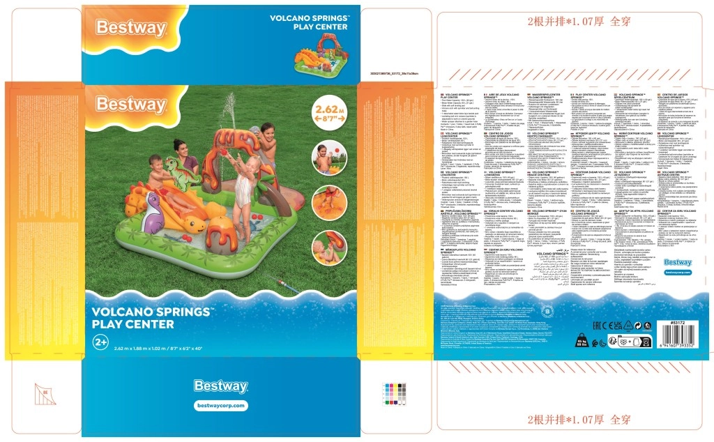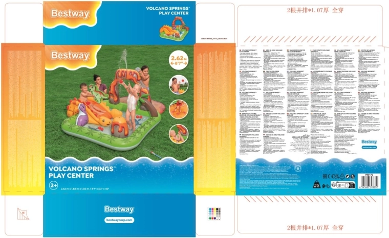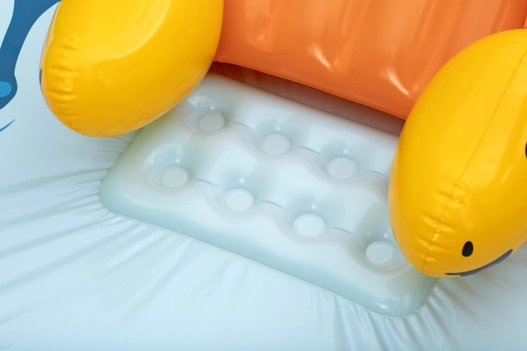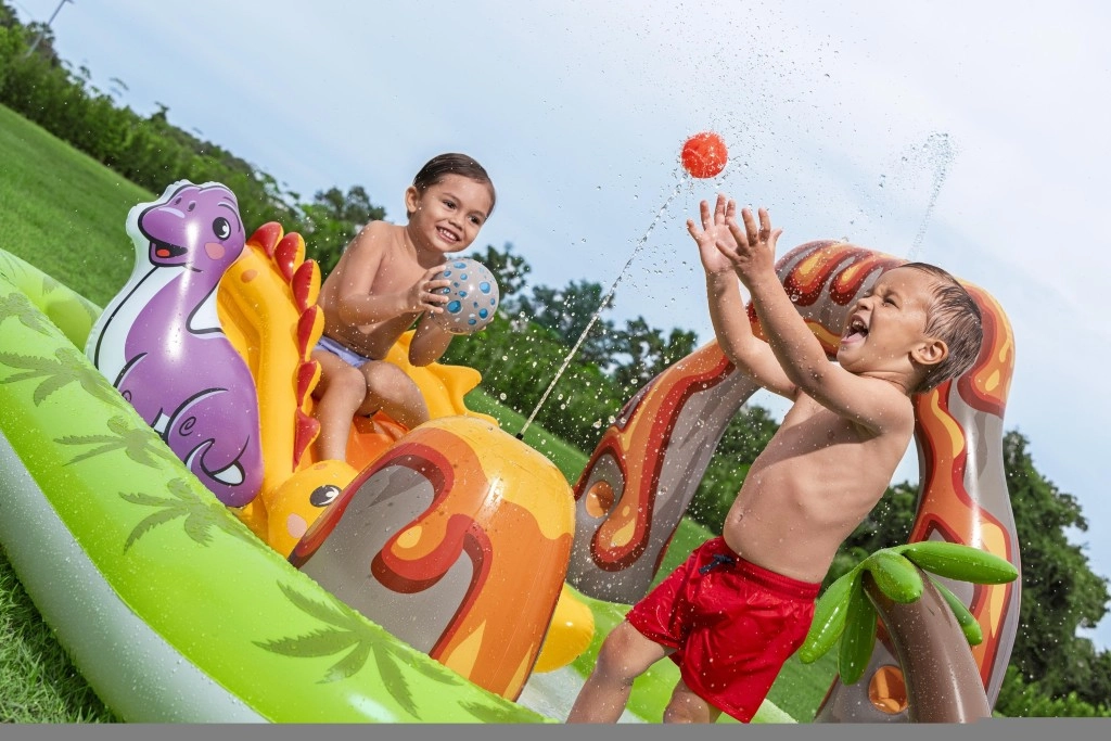 Započnite ljeto s ovim šarenim, nafukavajućim igraćim centrom s motivom dinosaura koji svaku okućnicu pretvara u mali vodeni park. Nudi prostrani plitki bazen 262 × 188 × 102 cm, mekani tobogan s pristajnim jastučićem i vodeni raspršivač koji se spaja na vrtnu slavinu/crevo. Djecu će oduševiti figure dinosaura, vulkanski luk s otvorom za ubacivanje loptica i vodena podloga za još više prskave zabave. Izdržljiv vinil osigurava sigurnu i dugotrajnu igru i pri čestoj uporabi.