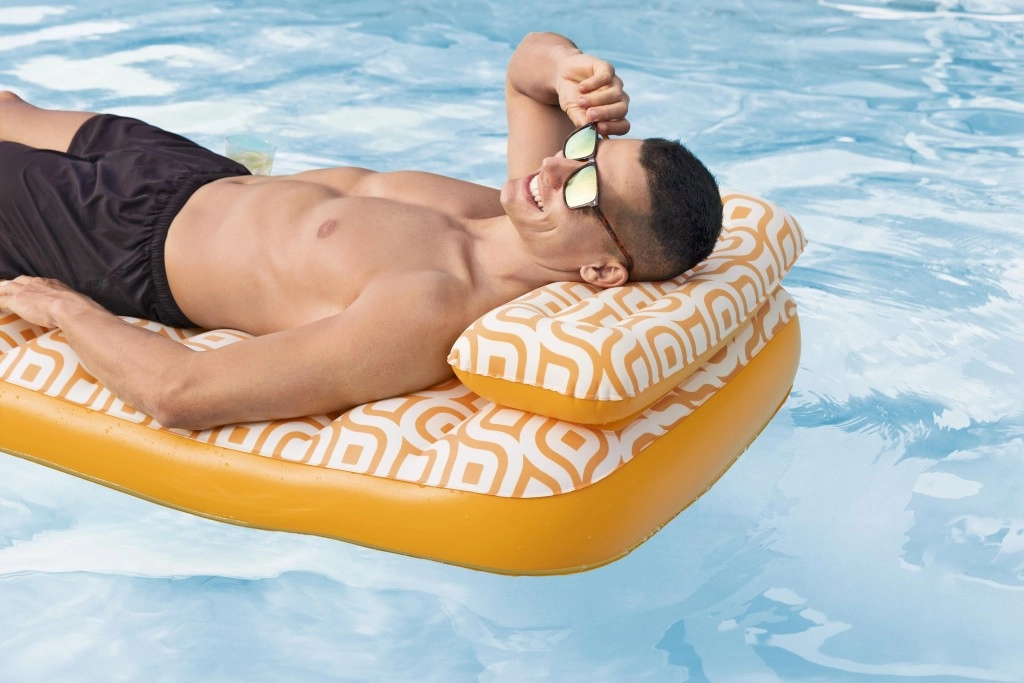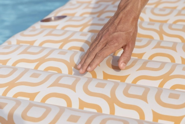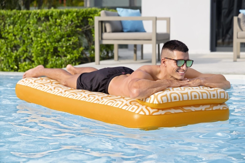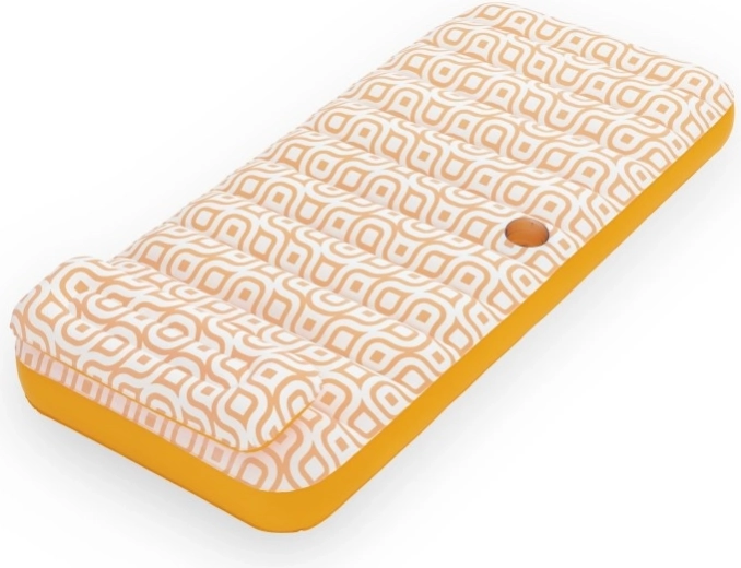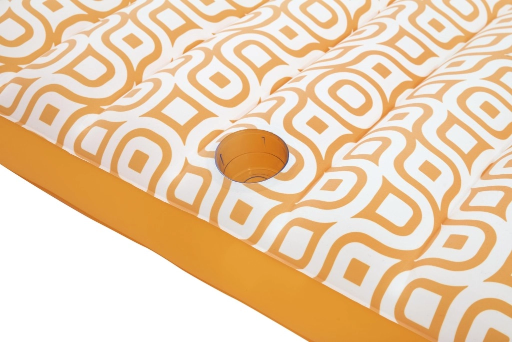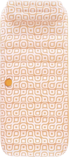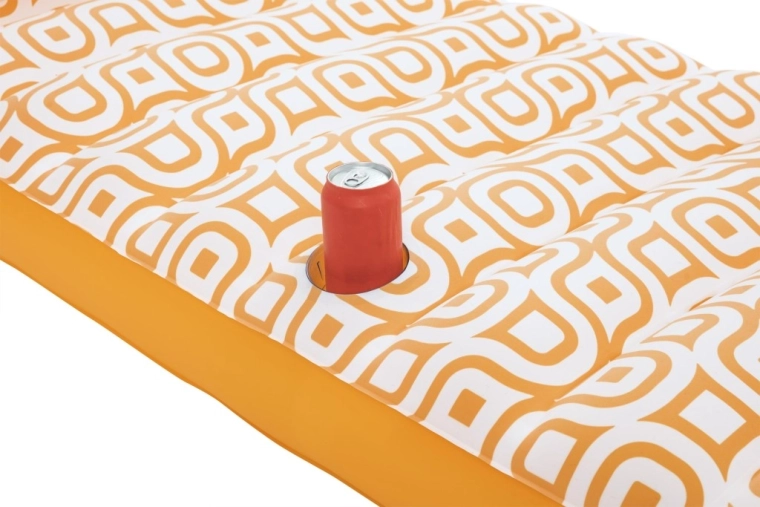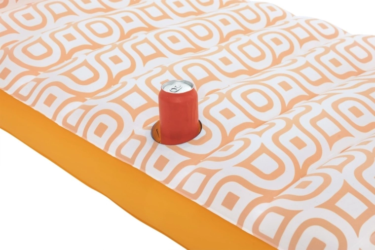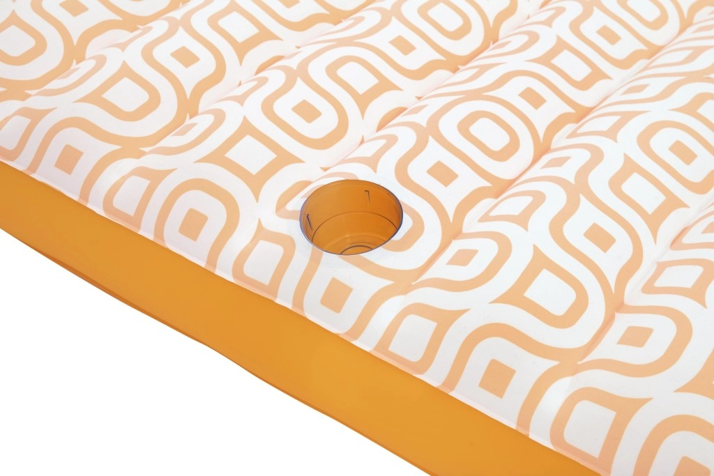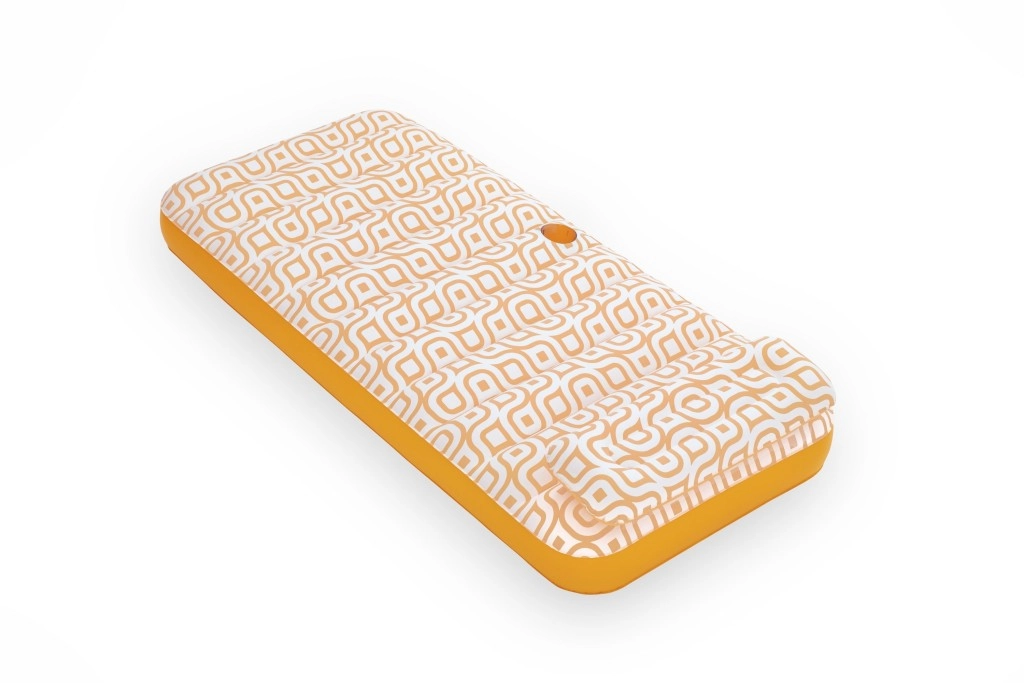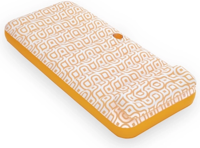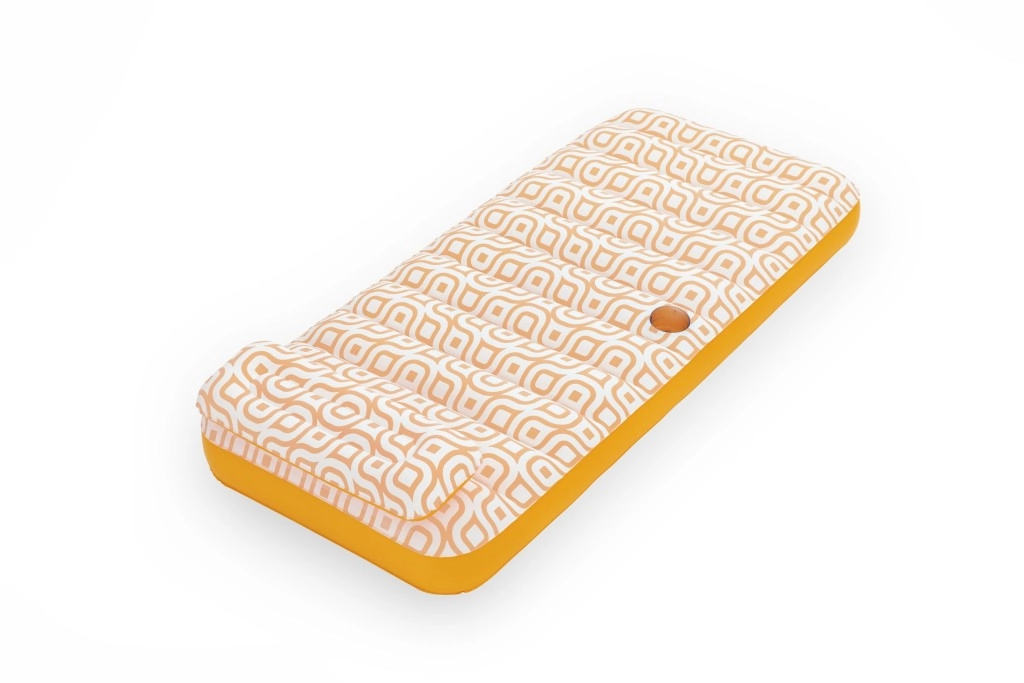 Nafukavajuće ležalo Comfort Plush idealan je izbor za opuštanje uz bazen i na mirnim vodenim površinama. Prostrana površina 183 × 84 cm lako nosi odraslu osobu do 100 kg, dok integrirani jastuk osigurava udobnu potporu glave. Baršunasto mekana, vodootporna površina s retro geometrijskim uzorkom u bijelo-narančastim tonovima daje elegantan izgled i ugodan dodir.