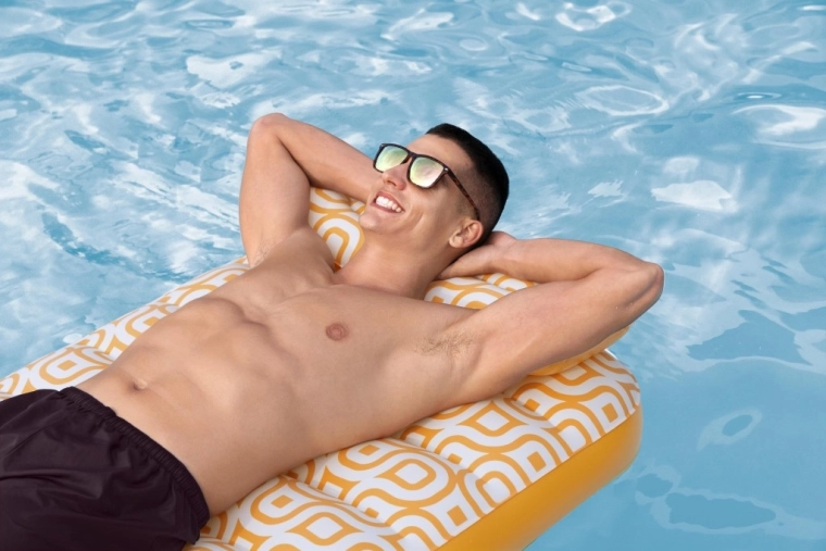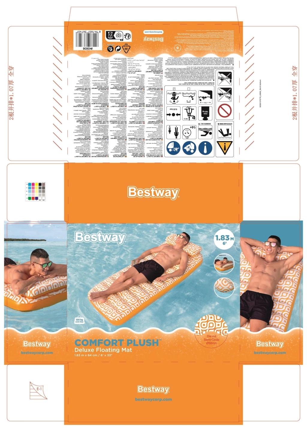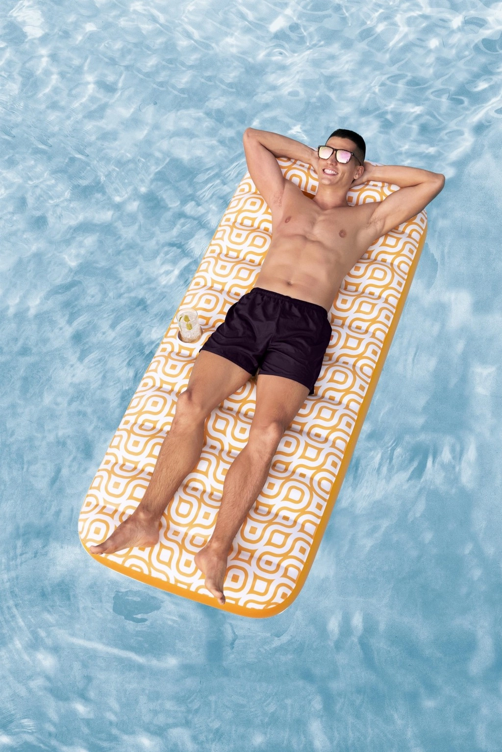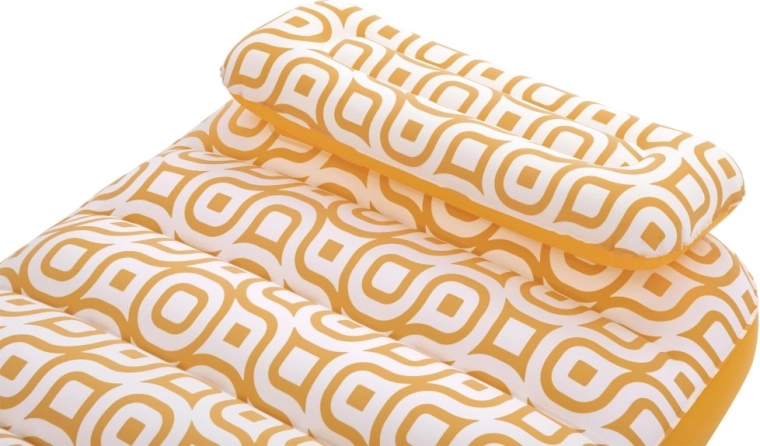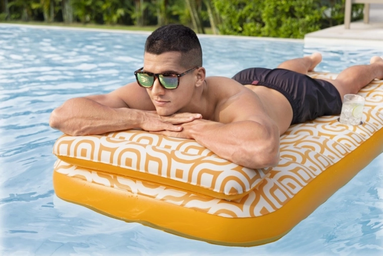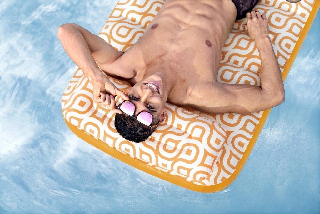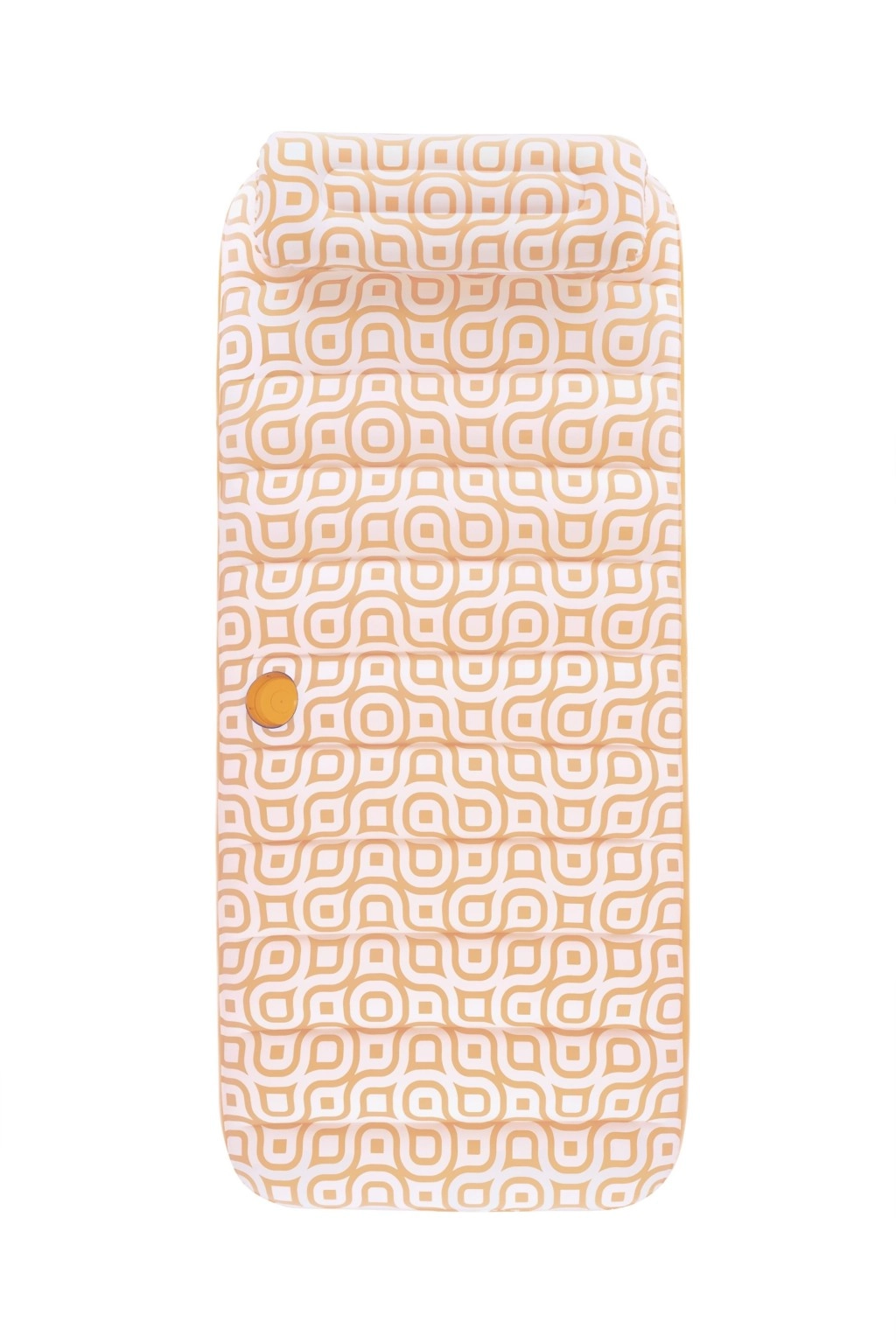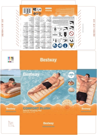 Nafukavajuće ležalo Comfort Plush idealan je izbor za opuštanje uz bazen i na mirnim vodenim površinama. Prostrana površina 183 × 84 cm lako nosi odraslu osobu do 100 kg, dok integrirani jastuk osigurava udobnu potporu glave. Baršunasto mekana, vodootporna površina s retro geometrijskim uzorkom u bijelo-narančastim tonovima daje elegantan izgled i ugodan dodir.