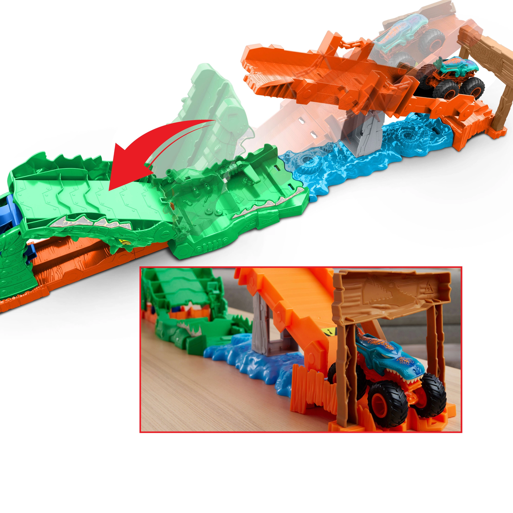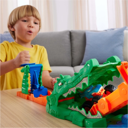 Ovaj šareni kaskaderski set spaja akciju, napetost i kreativnu igru. Izbaci Mega Wrex niz narančastu rampu, savladaj pokretni most i pokušaj preskočiti gladnog krokodila – ili ćeš završiti ravno u njegovim čeljustima. Ishod ovisi o snazi izbačaja, pa je svaka vožnja drugačija, a djeca vježbaju koordinaciju i procjenu.