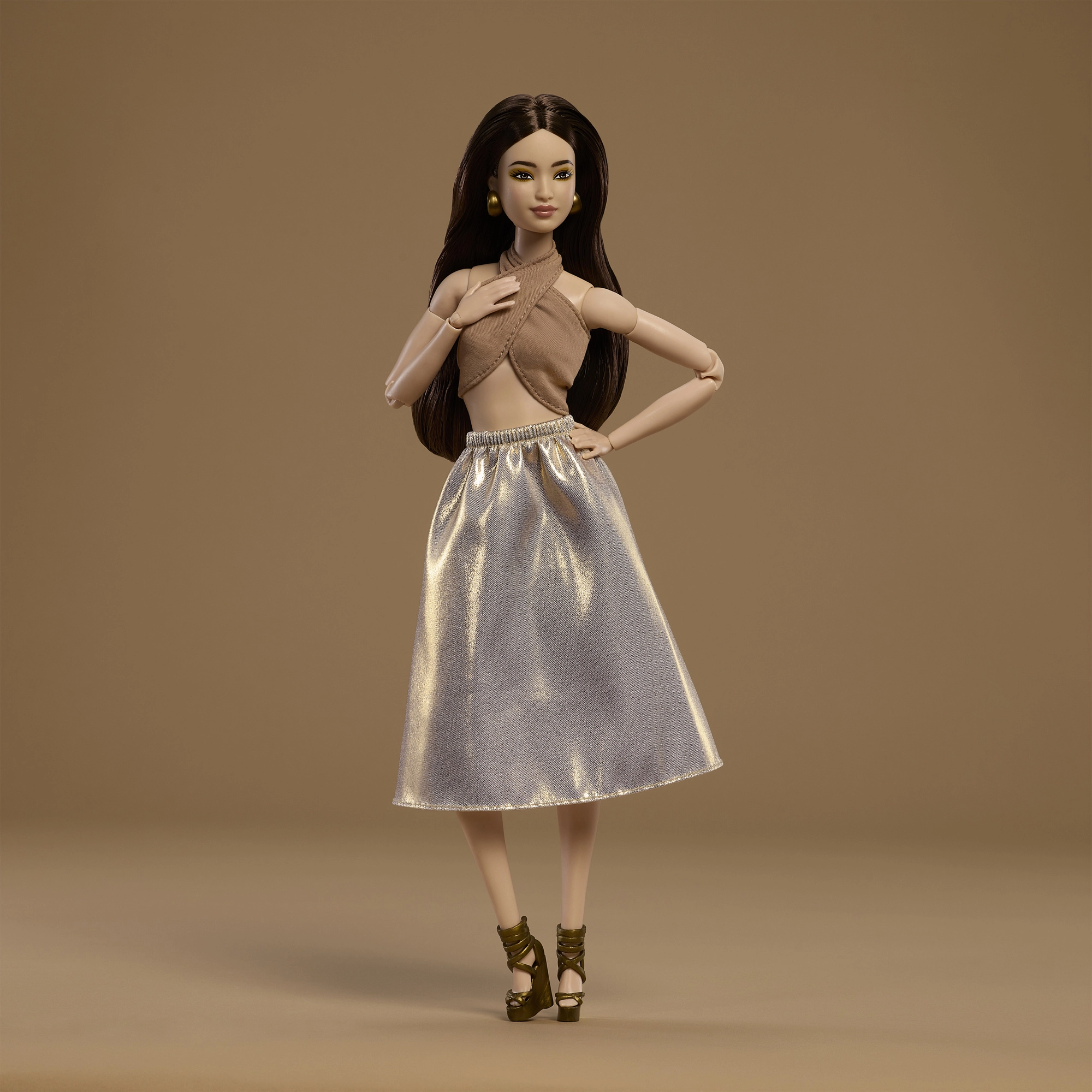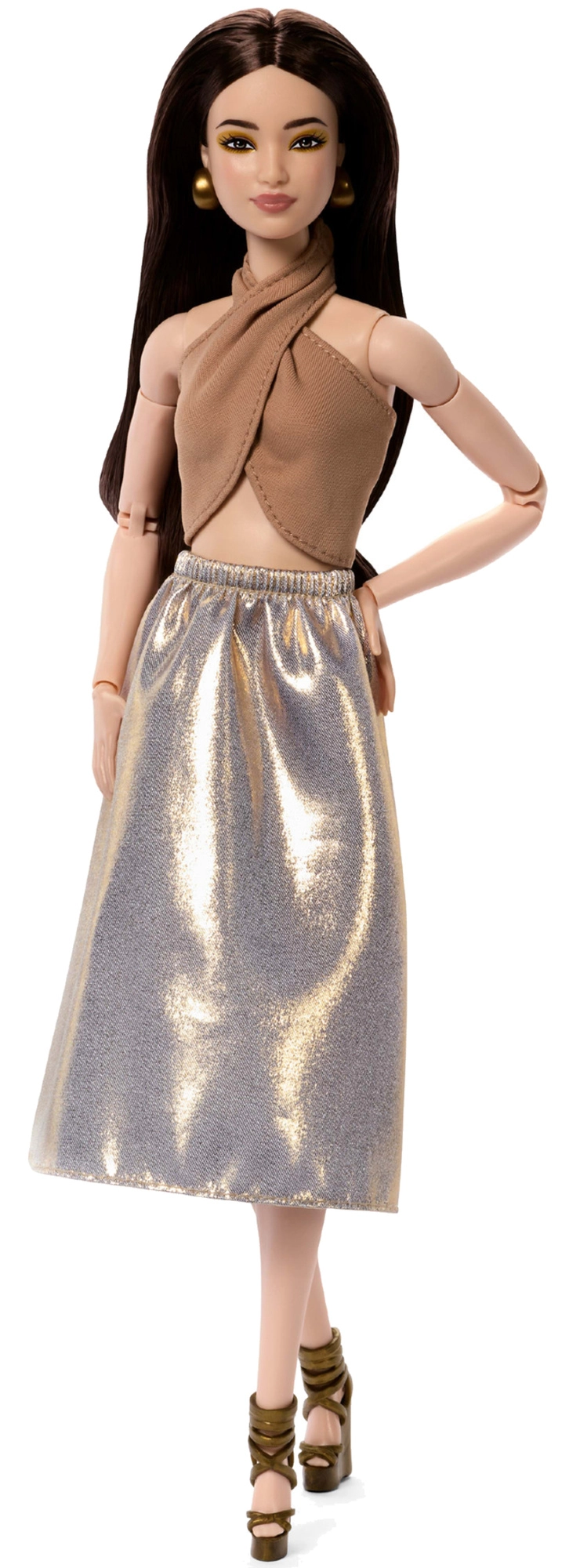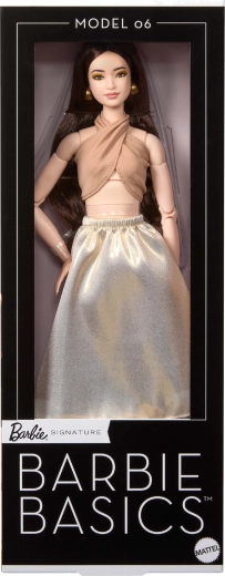 Model 06 iz serije Barbie Signature Basics donosi minimalističku eleganciju u nijansama svijetlosmeđe i zlatne. Kombinacija elegantnog topa i lepršave suknje naglašava moderan, bezvremenski izgled. Lutka ima svjetliji ten, vitku siluetu i skladan, decentan make-up koji ističe njezinu prirodnu ljepotu.