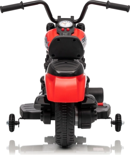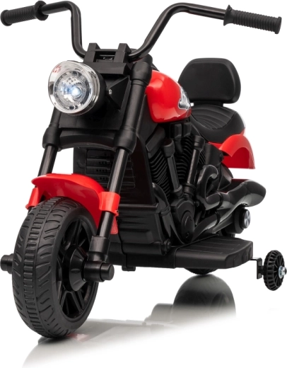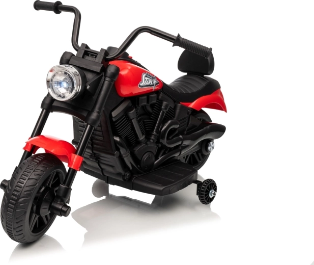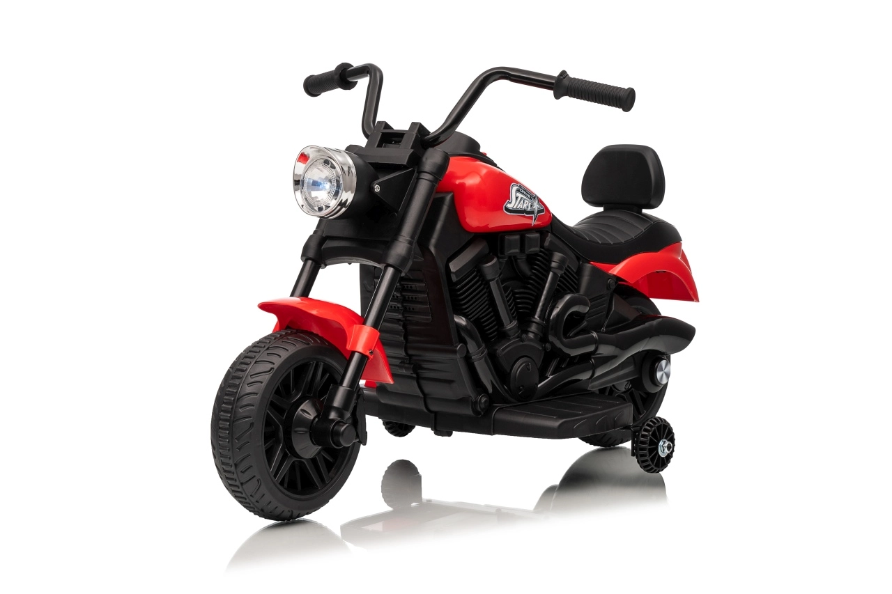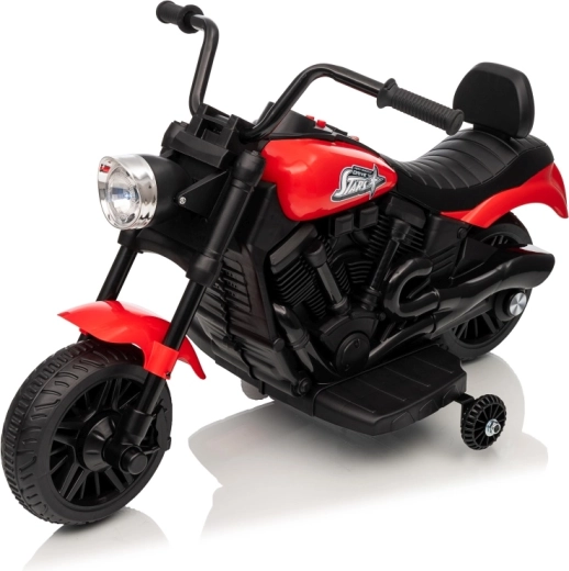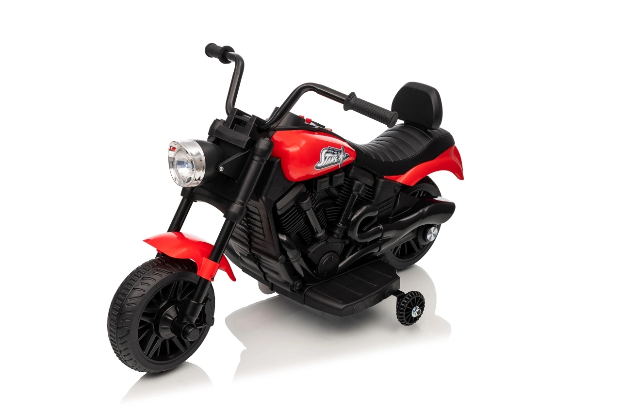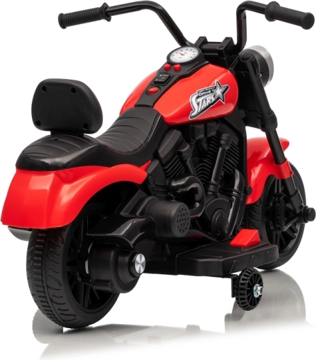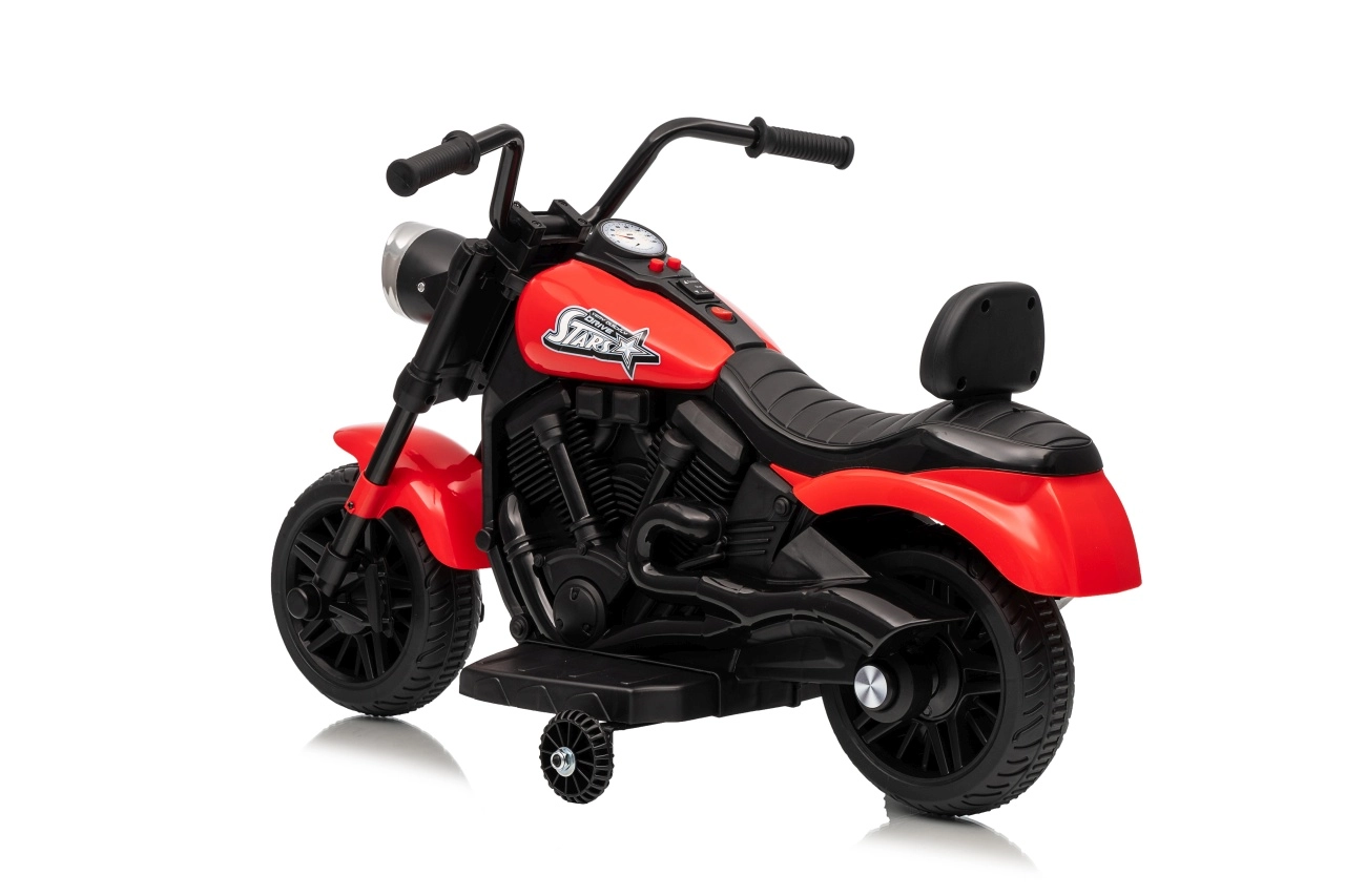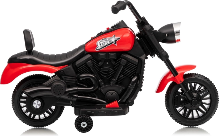Stilizan dječji električni motor STAR u crvenoj boji nudi sigurnu zabavu za male vozače. Opremljen je motorom 30 W, baterijom 6 V 4,5 Ah, sporim startom za glatko pokretanje, vožnjom naprijed i natrag te prednjim LED svjetlom. Stabilnost osiguravaju pomoćni bočni kotači, a udobnost pruža profilirano sjedalo s naslonom.