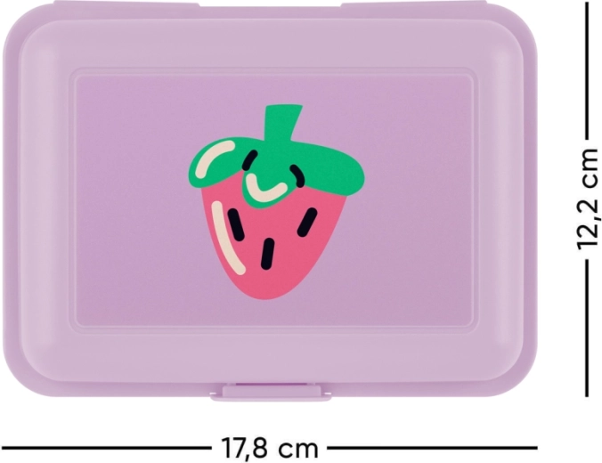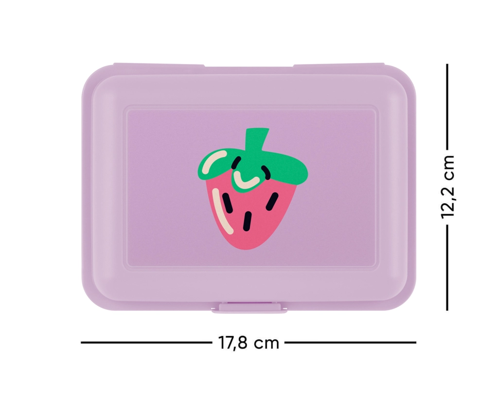 Stilna i praktična kutija za užinu u ljubičastoj boji s motivom Lavender Jagoda brenda Baagl. Nudi sigurno zatvaranje jednim zasunom i unutarnju pregradnu stijenku za odvajanje namirnica. Idealna za školu, posao i putovanja.
