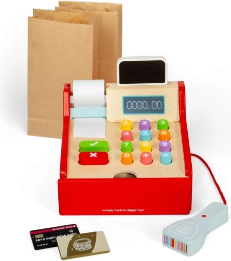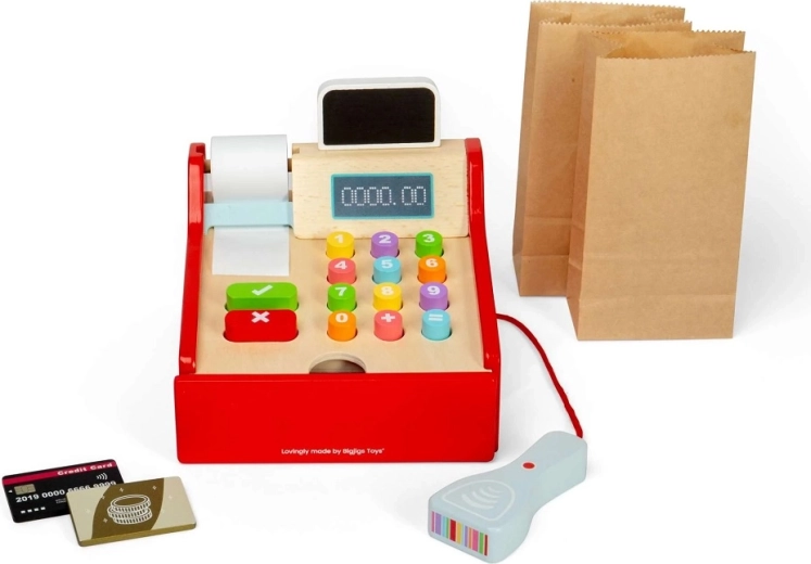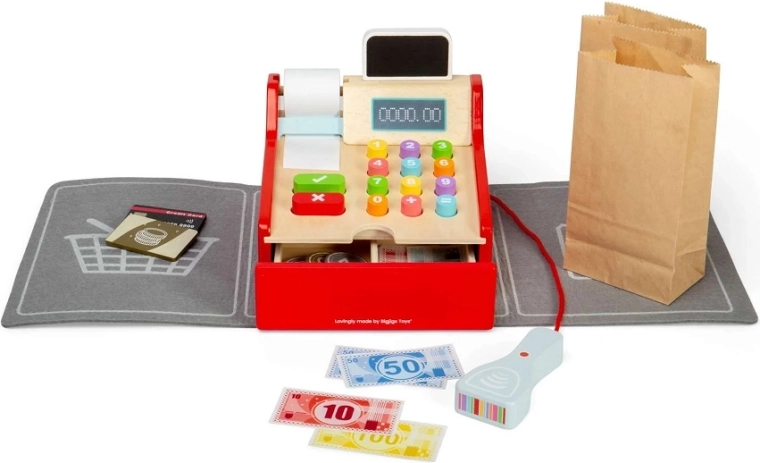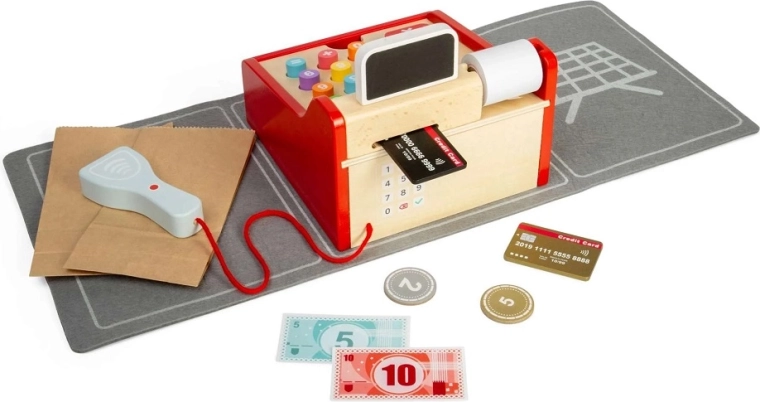 Stilska drvena blagajna za male prodavače pretvara svaku dječju trgovinu u realističnu prodavaonicu. Djeca mogu skanirati robu, računati cijene, izdati račun i primati plaćanja karticom i gotovinom. Velike tipke za male ruke, priloženi skener i pribor potiču igru uloga, razvoj komunikacije, socijalnih vještina i financijske pismenosti. Izrađeno od FSC® drva – ekološki prihvatljivo i izdržljivo za svakodnevnu igru.