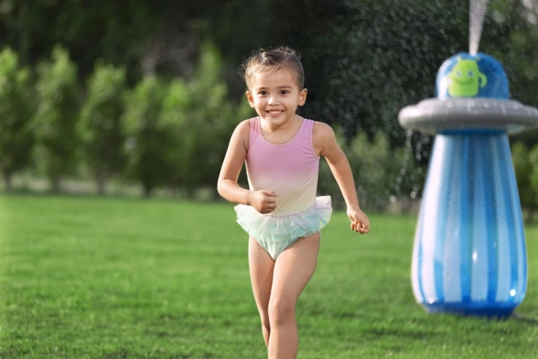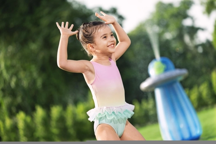 Nakon spajanja na standardno vrtno crijevo, iz gornjeg dijela NLO-a pokrene se osvježavajući raspršivač koji stvara razigranu fontanu za djecu.