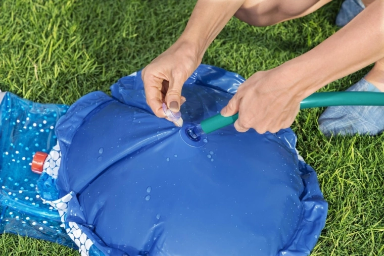 Izrađeno od izdržljivog PVC-a s prozirnim plavim „kokonom” i sivim prstenom. U pakiranju je uključena zakrpa za brze popravke.