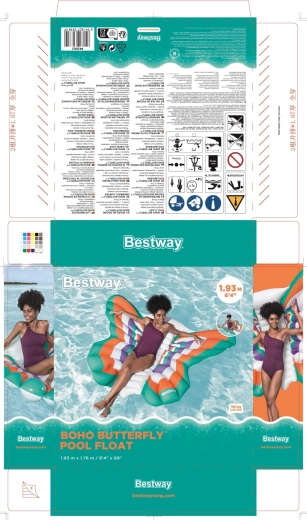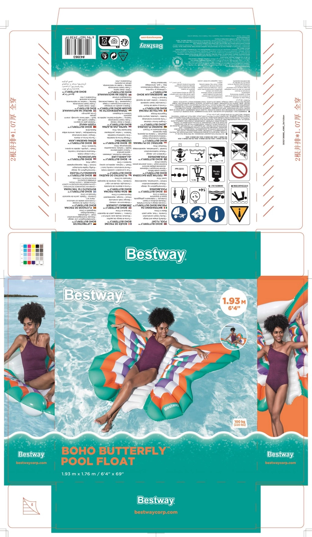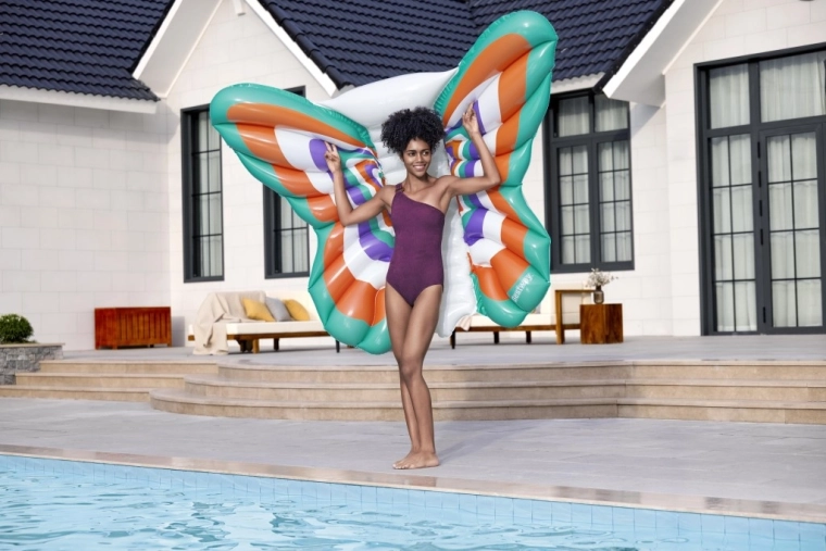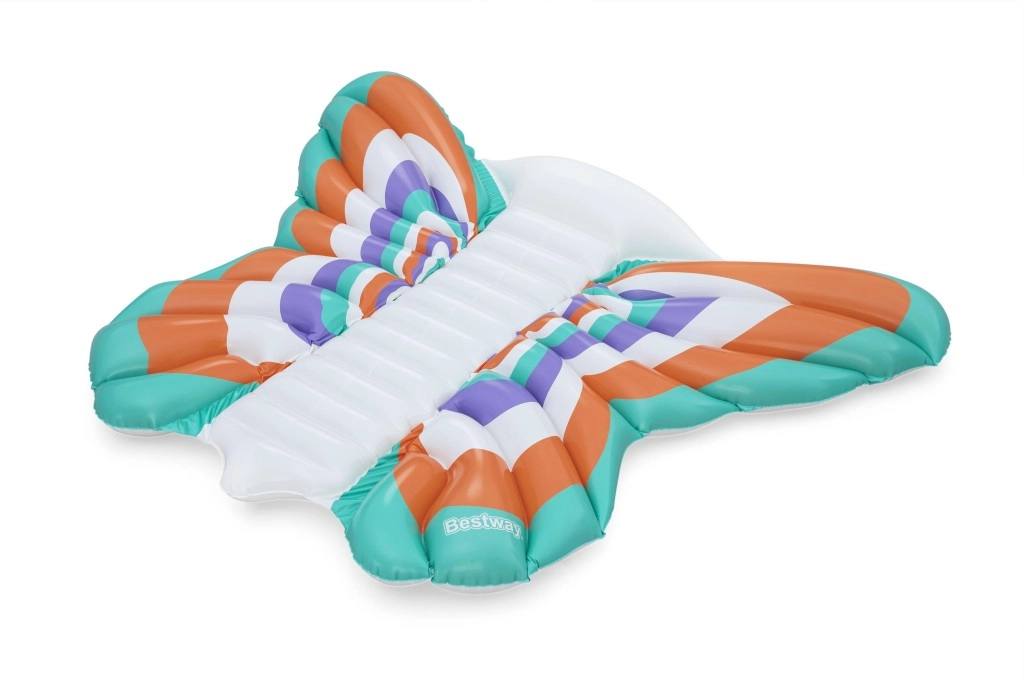 Uživajte u ljetu na vodi s napuhujućim madracem u obliku leptira dimenzija 193 × 176 cm. Nudi prostrano i udobno ležanje, stabilnost na vodi i izdržljiv materijal s tehnologijom Color Shield™, koja održava boje živima i ne ostavlja tragove na mokroj koži. Zahvaljujući maksimalnoj nosivosti od 100 kg i brzom ventilu za napuhavanje idealan je za bazen, jezero i more.