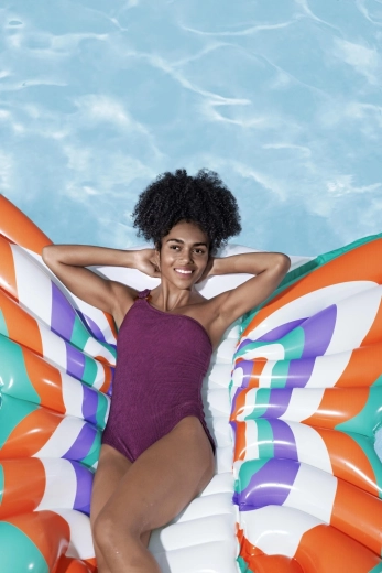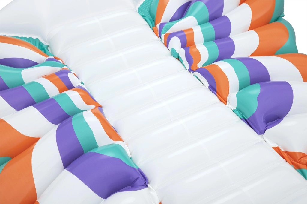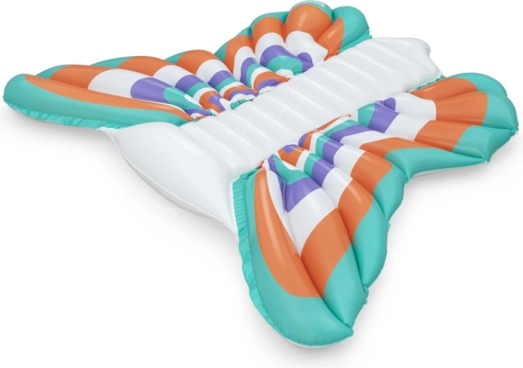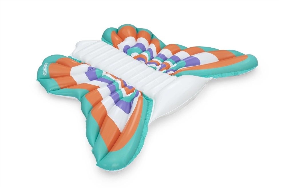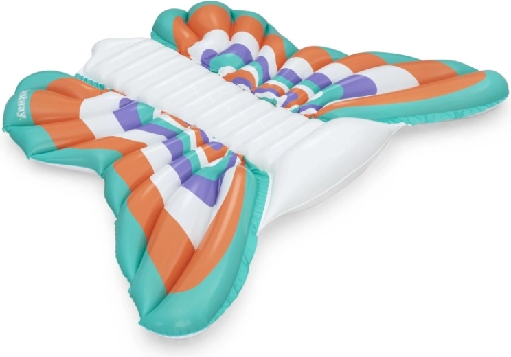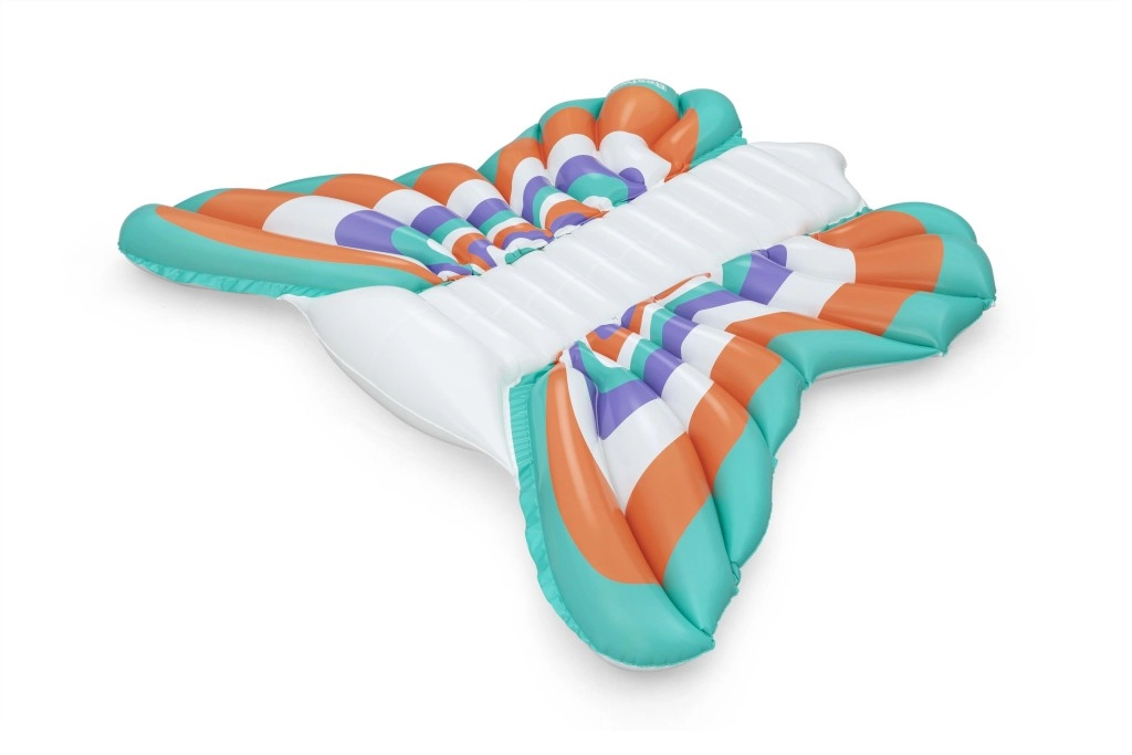 Ovaj stilski napuhujući madrac s dizajnom leptirovih krila donosi sjajnu kombinaciju udobnosti i zabave. Šareni paneli u tonovima narančaste, tirkizne, ljubičaste i bijele stvaraju privlačan izgled, dok rebrasta središnja traka pruža udobno oslonjeno ležanje i opušten položaj na vodi.