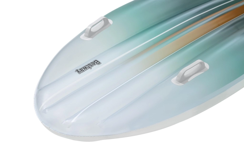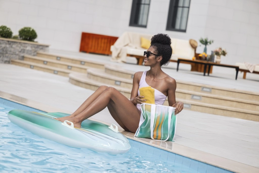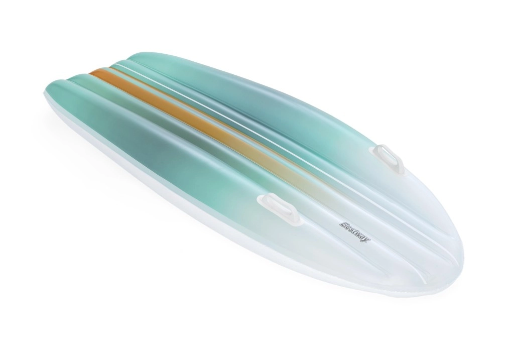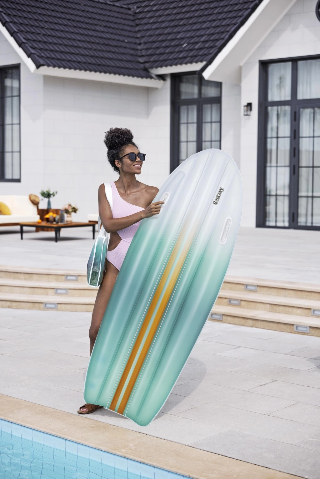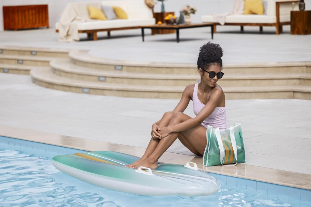 Set BESTWAY TAHITI spaja praktičnost i stil za bezbrižan odmor uz vodu. Ležalo s hidrodinamičnim oblikom i dvjema integriranim ručkama pruža sigurnost pri ulasku i tijekom opuštanja. Usklađen cijan gradijentni tisak na ležalu i torbi djeluje svježe i ljetno, pa ćete se istaknuti i uz bazen i na plaži.