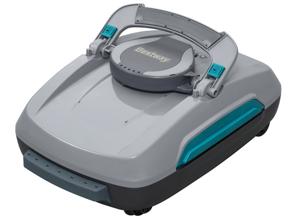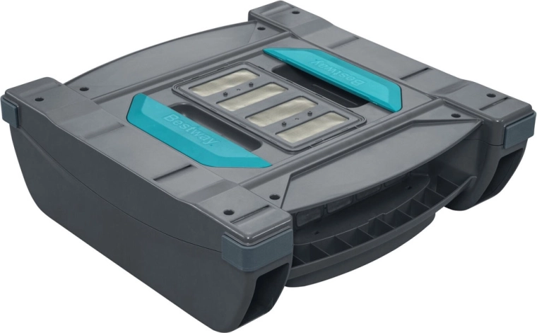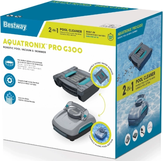 BESTWAY Aquatronix Pro G300 moderan je, potpuno automatski bežični robot 2u1 koji čisti dno bazena i površinu vode. Zahvaljujući ugrađenoj bateriji radi do 120 minuta, bez zapetljanih kabela. Velike košare za nečistoće (3,5 l za dno i 6 l za površinu) i pametni senzori za automatsko uključivanje/isključivanje osiguravaju udobno, sigurno i učinkovito održavanje, posebno za nadzemne bazene s ravnim dnom.