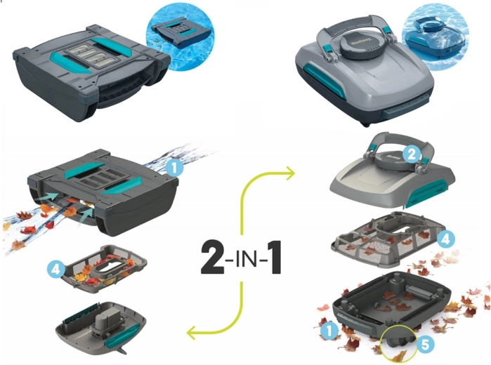 Dva lako izmjenjiva modula omogućuju usisavanje dna i skimmer skupljanje nečistoća s površine. Održavajte bazen potpuno čist bez dodatnih uređaja.
