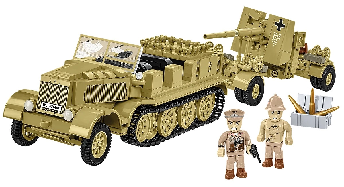 U kompletu su 2 figurice topnika u pustinjskim uniformama (uključujući tropsku kacigu), pokretni mehanizmi topa (okretno postolje, podesiva cijev) te realistične gusjenice i podvozje tegljača. Ne nedostaju sanduk s municijom, oznaka sa skalom i čitljive slikovne upute. Set je kompatibilan s drugim markama i zadovoljava sigurnosne norme.