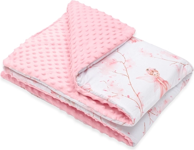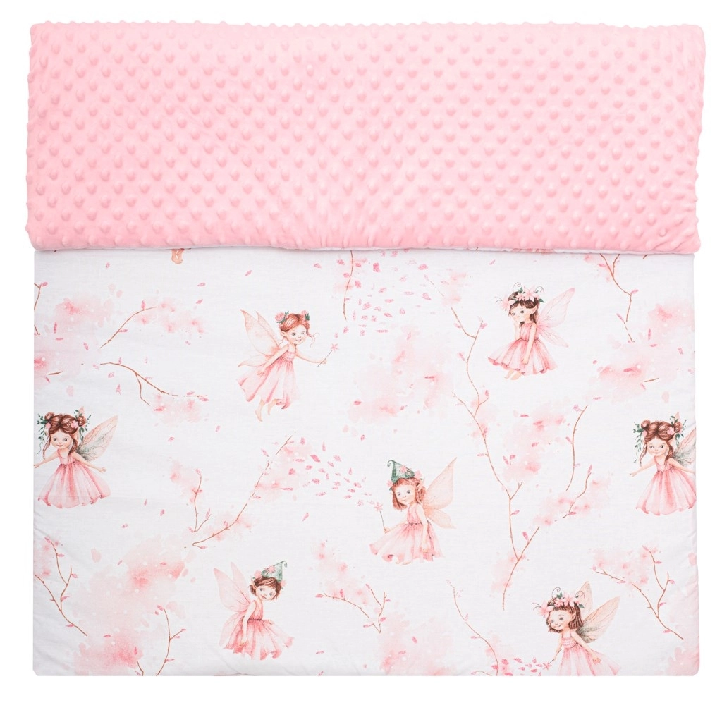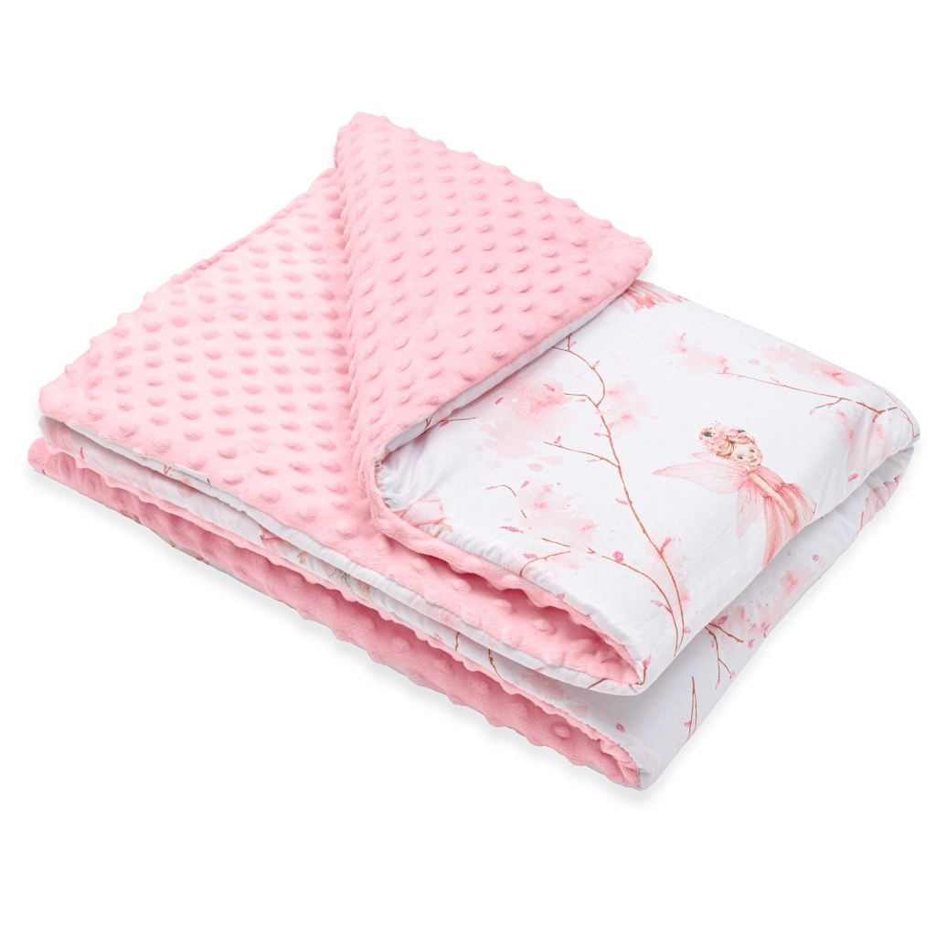 Mekana dječja dekica New Baby s motivom vila kombinira nježnu minky tkaninu s 3D točkicama za osjetilnu stimulaciju i prozračnu 100% pamuk s nježnim printom. Zahvaljujući antialergijskom punjenju dekica je ugodno topla, idealna za kolica, krevetić i autosjedalicu. Ne pušta boju, nježna je prema osjetljivoj koži i bez je gumba ili tvrdih dijelova za maksimalnu sigurnost.
