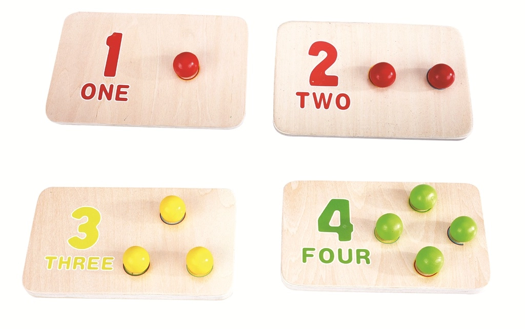 Svaka pločica prikazuje broj i odgovarajući broj otvora za štapiće/kuglice. Djeca tako prirodno povezuju znamenku s količinom i vježbaju finu motoriku.