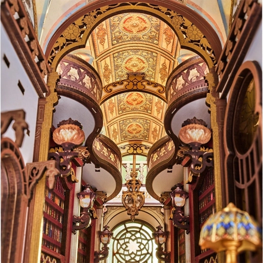 Ornamenti, zasvođeni stropovi, stupovi i bogato ukrašeni balkoni prizivaju klasičnu knjižnicu – detaljna izvedba razveselit će svakog ljubitelja dizajna.