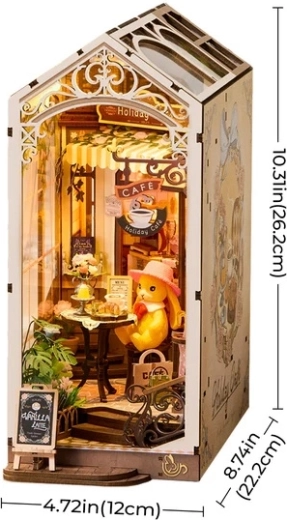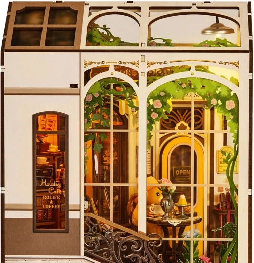 Ova detaljno izrađena minijatura donosi atmosferu ugodne ljetne kavane izravno u vašu policu s knjigama. Otvorena konstrukcija sa širokim bočnim prozorima, realistični dodaci i toplo LED pozadinsko osvjetljenje pretvaraju policu u mali svijet pun mira i nostalgije. Model ujedno izvrsno služi kao stabilan držač za knjige i stilska dekoracija za stol ili policu.