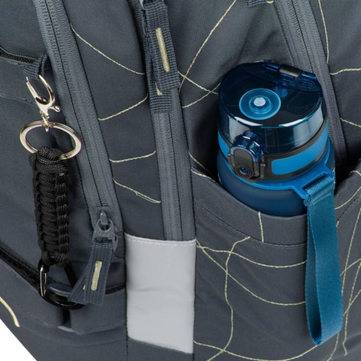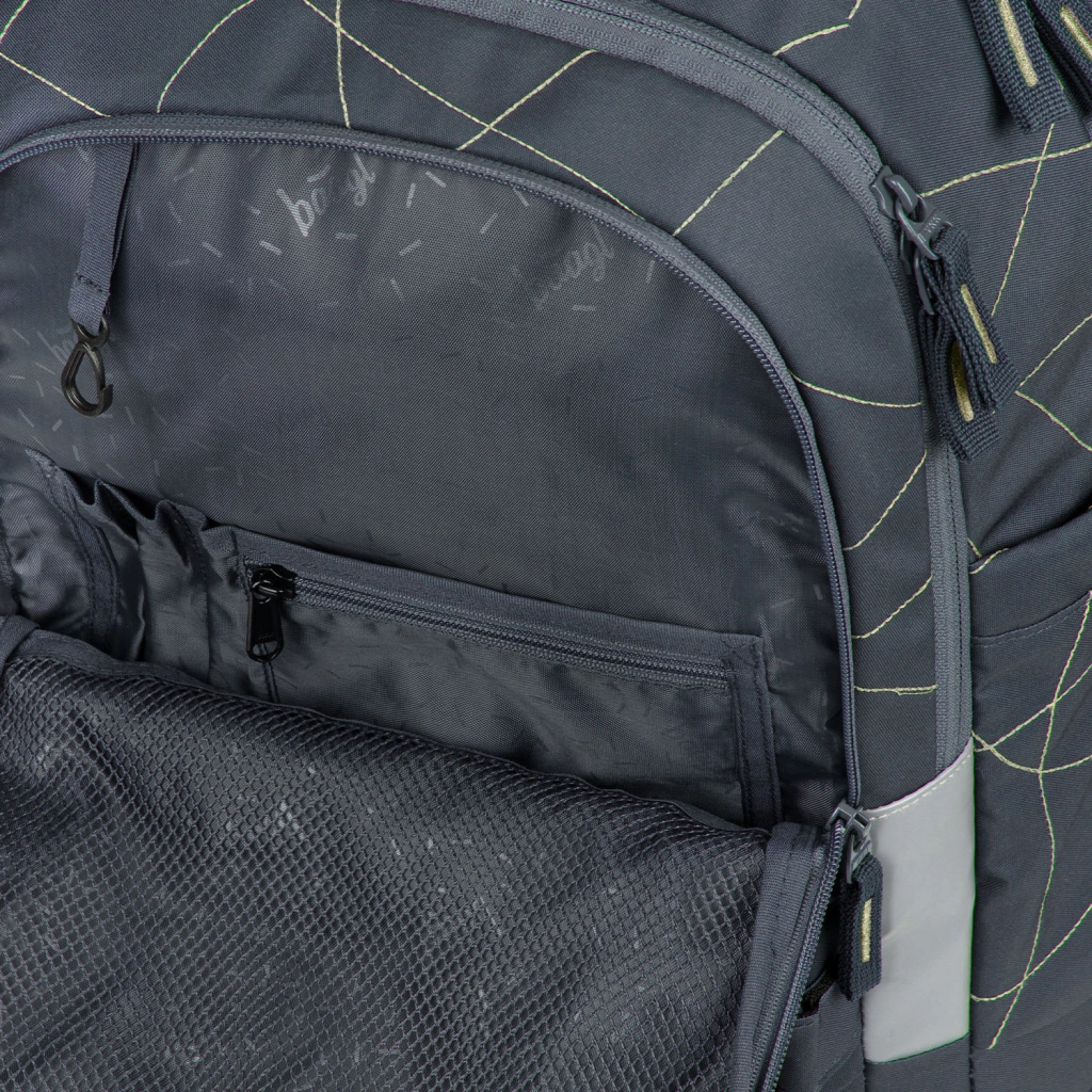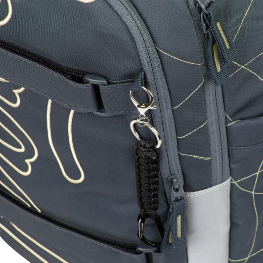 Unutrašnjost čini trokutni organizator s baršunastim džepom za prijenosno računalo koji štiti elektroniku od ogrebotina. Čvrsti bočni džepovi primaju BAAGL boce od tritana, prednja kompresija pridržava majicu ili skateboard, a stilski privjesak daje torbi osobit izgled.