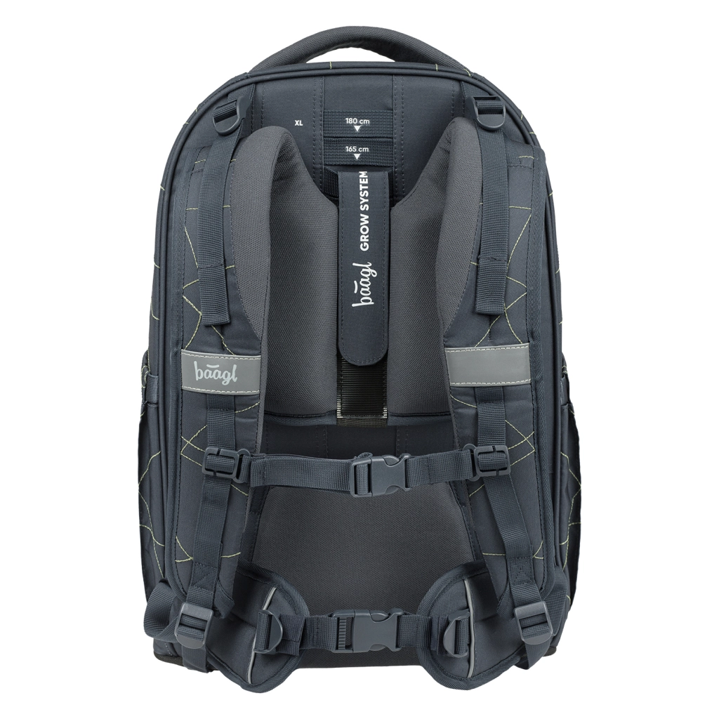 Školski set BAAGL Skate Max Wave osmišljen je za učenike otprilike od 3. razreda osnovne škole do srednje škole (135–185 cm). Glavna zvijezda je lagani ruksak (1150 g) s visinski podesivim leđnim sustavom u čak četiri veličine, koji se savršeno prilagođava rastu djeteta. Čvrsta EVA ojačanja drže oblik, odvojivi lumbalni pojas osigurava stabilnost, a reflektirajući elementi povećavaju vidljivost u sumrak.