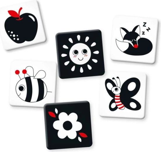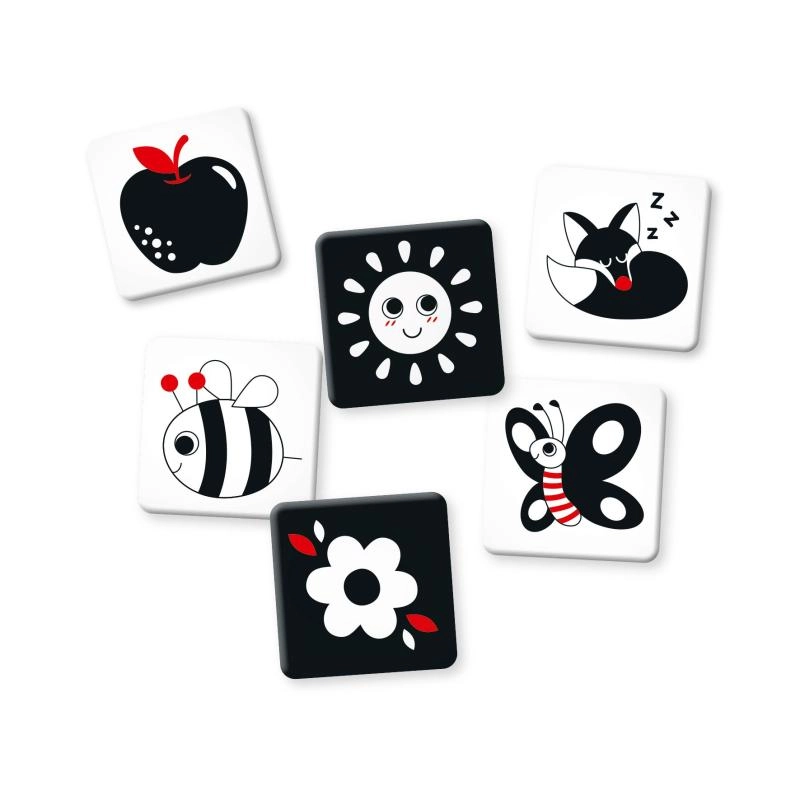 Ova jednostavna edukativna igra idealna je za mirne trenutke na podlozi, u krevetiću, kolicima ili tijekom vremena na trbuščiću. Zahvaljujući kontrastima dijete dobiva snažne podražaje za rani kognitivni razvoj i uči se usredotočiti na oblik, uzorak i obris.