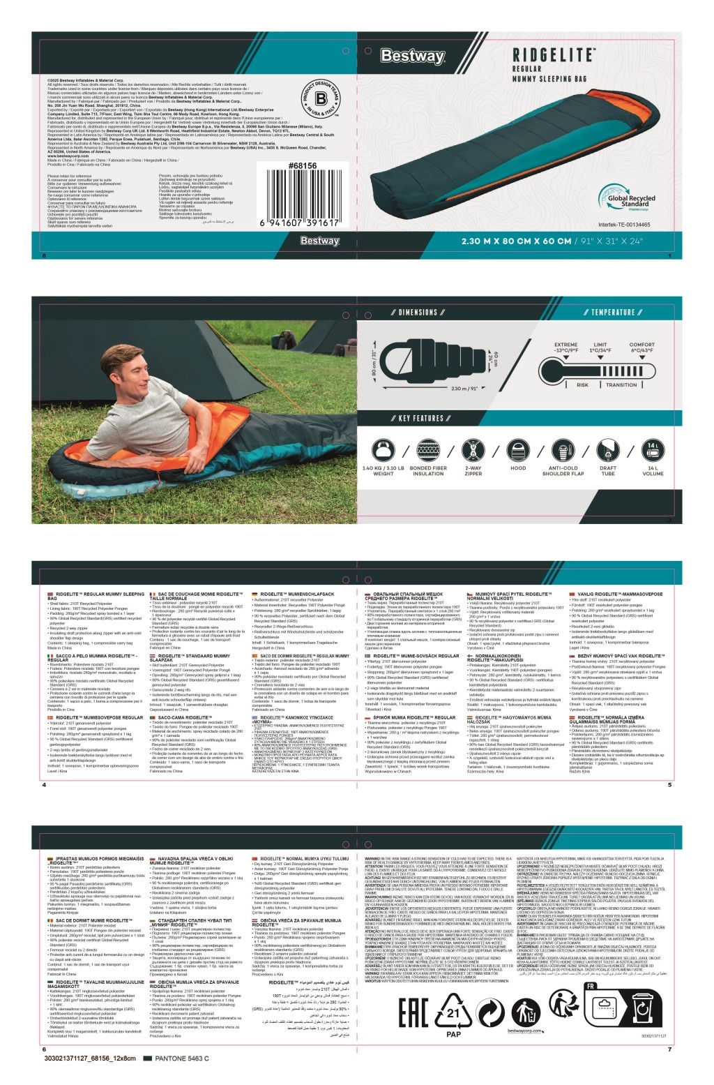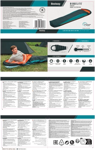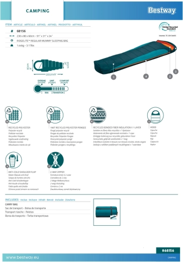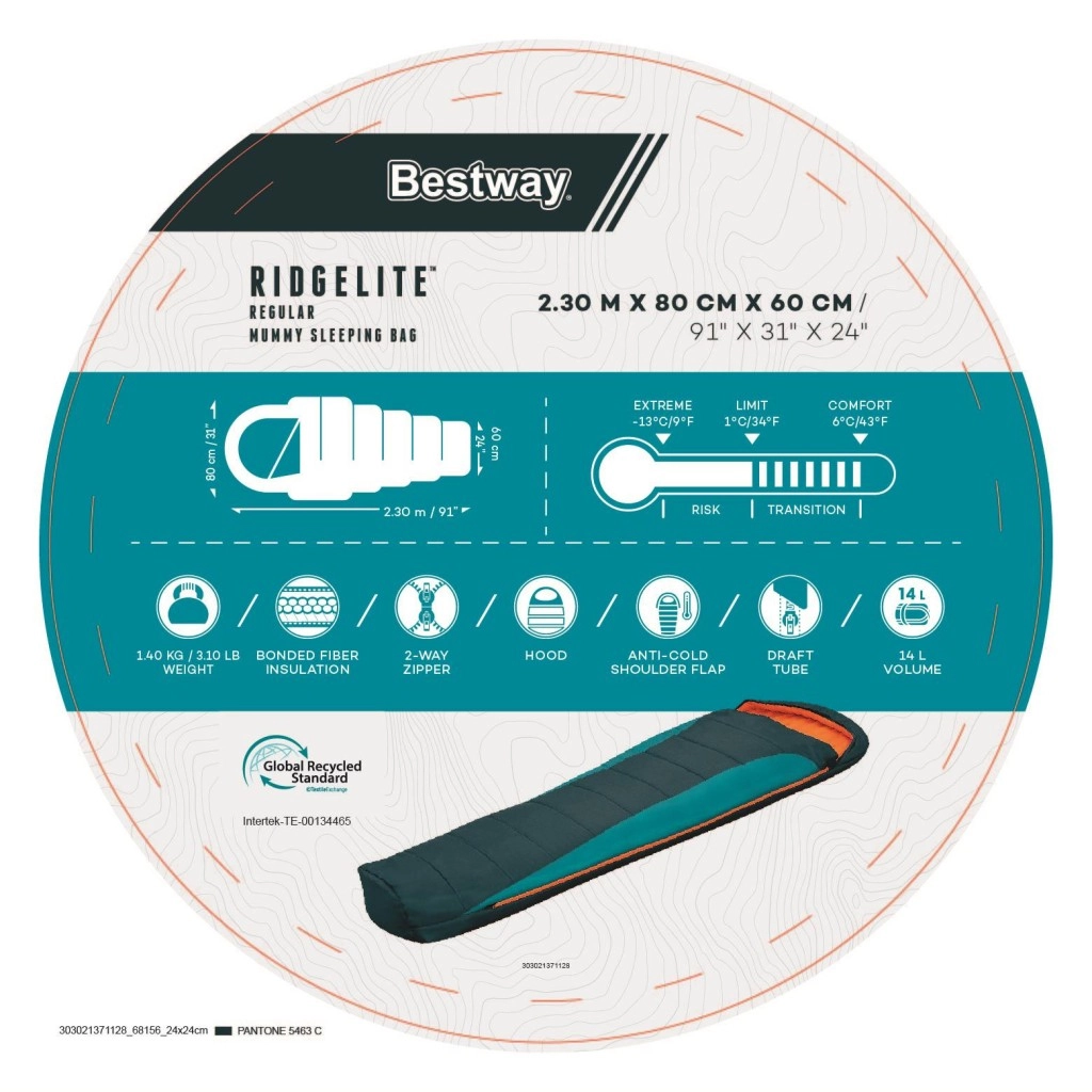 BESTWAY Ridgelite je mummy vreća za spavanje koja kombinira toplinsku udobnost, malu težinu i održiv pristup. Ergonomski oblik 230 × 80/60 cm minimalizira gubitke topline, dok punjenje iz jednog sloja recikliranog poliestera 280 g/m² i materijali s GRS certifikatom osiguravaju odgovoran odabir za prirodu i pouzdane performanse na terenu.
