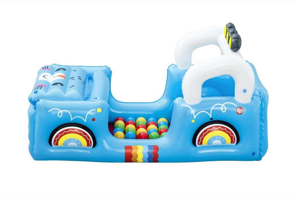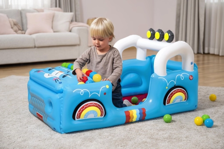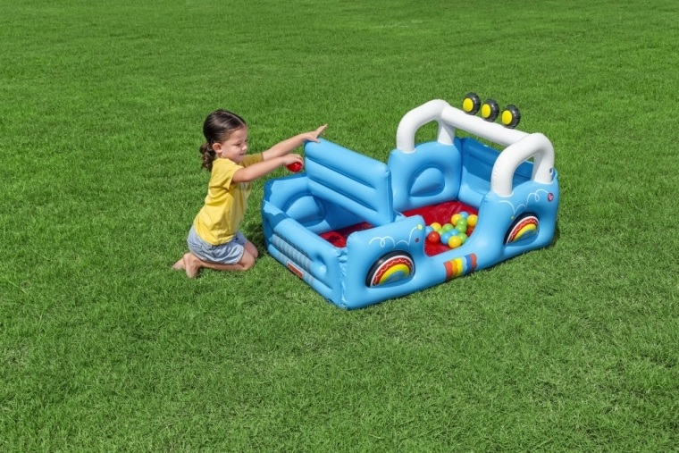 Nafukavajuće igraće središte u obliku auta sa safari motivima pruža djeci od 2 godine udobno i sigurno mjesto za igru u domu i na otvorenom. Zahvaljujući mekim nafukavajućim stranicama i crvenom podu, sjedenje i kotrljanje loptica maksimalno su udobni i sigurni. Šareni detalji, vesele životinje i bijeli „roll barovi” s dekorativnim svjetlima potiču maštu i tematsku igru.