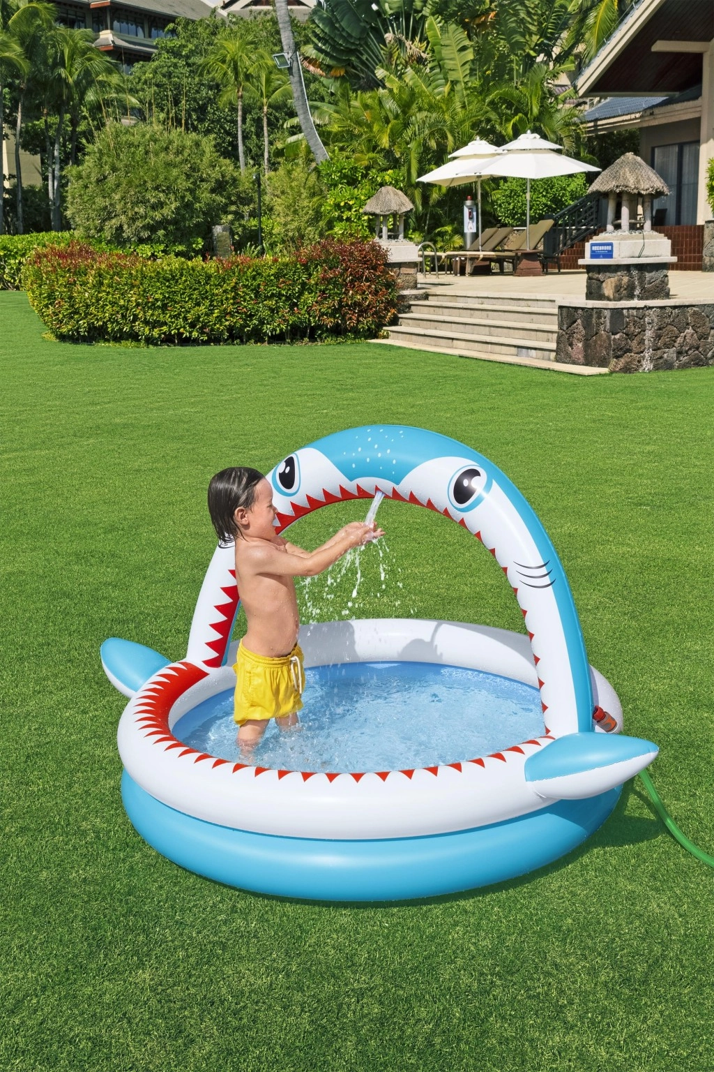 Luk u obliku „ralja morskog psa” raspršuje vodu nakon spajanja vrtnog crijeva i pretvara bazen u zabavno vodeno igralište.