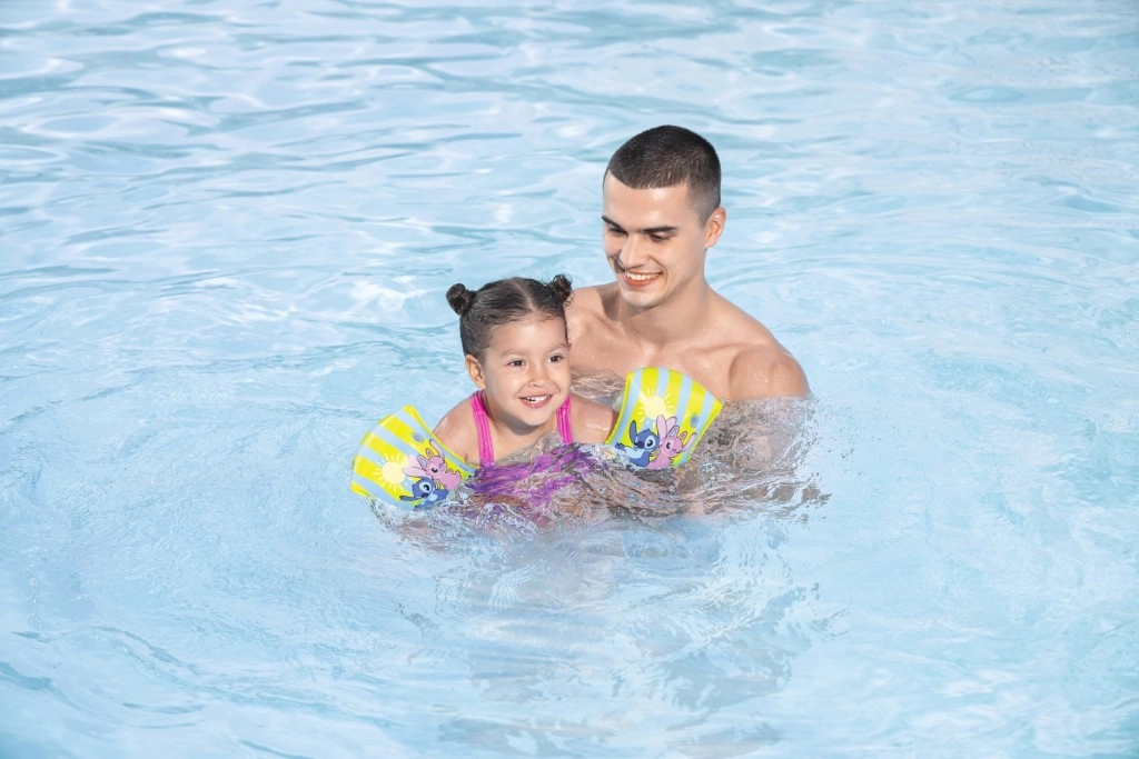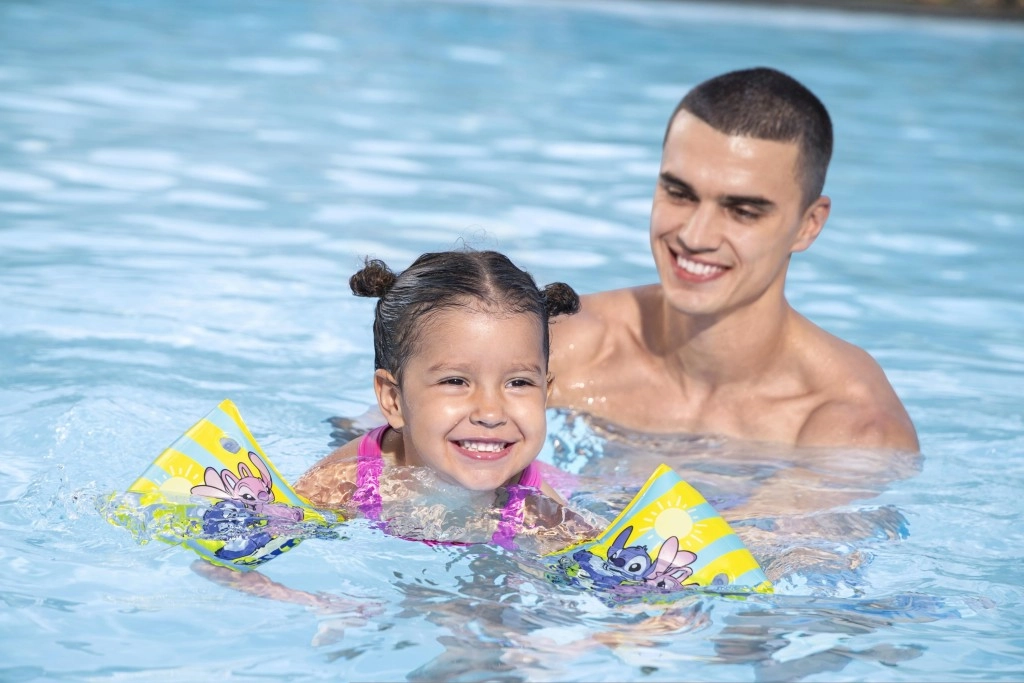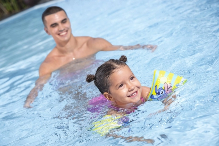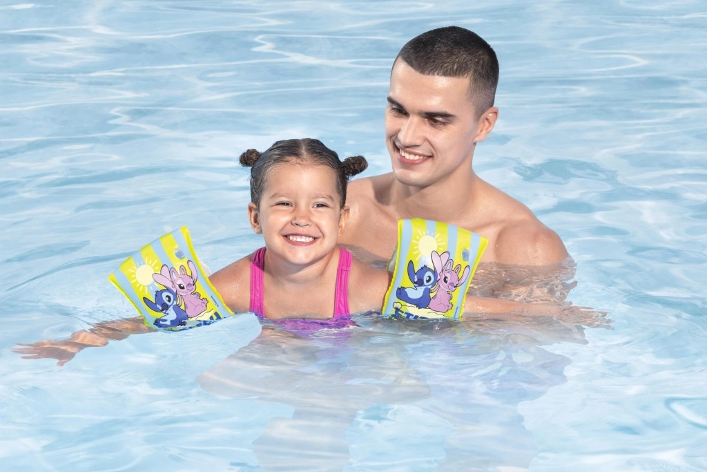 Veseli nafušeci rukavi s motivom DISNEY STITCH pomažu djeci u dobi 3–6 godina steći sigurnost u vodi. Izdržljiv PVC, udoban oblik, sigurnosni ventili i uočljive žuto-plave pruge za bolju vidljivost uz bazen.