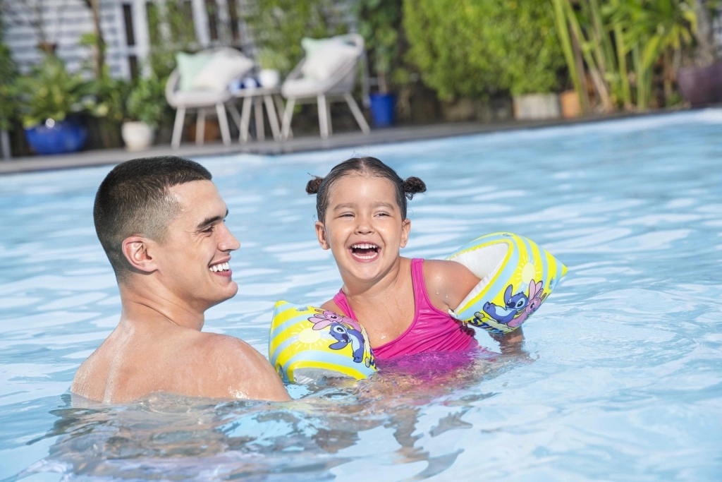 Izdržljiv i gladak PVC materijal ugodan je na dodir, lako se održava i podnosi često korištenje. Sigurnosni ventili omogućuju brzo napuhavanje i ispuštanje te sprječavaju neželjeni gubitak zraka tijekom igre u vodi. Vesela grafika likova Stitch i Angel te uočljive boje motiviraju djecu na kretanje i povećavaju njihovu vidljivost uz vodu.
