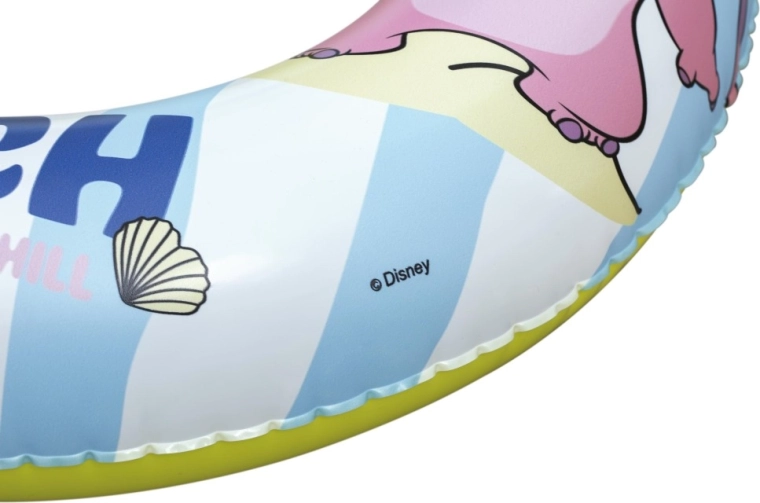 Stilski izgled u plavo-bijelim prugama s veselim ilustracijama Stitcha, školjki i palmi nadopunjuje žuta donja strana za bolju vidljivost. Praktični povratni ventil omogućuje brzo napuhavanje i ispuhivanje – idealno za putovanja, odmor, kupališta i kućni bazen.