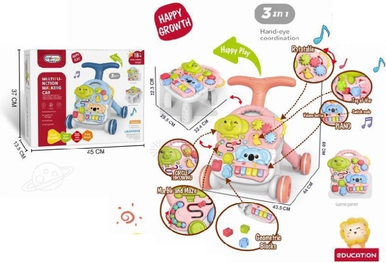 Multifunkcionalna guralica i edukativni stolić 3 u 1 podržava prirodan razvoj djeteta od 12 mjeseci. Nudi guralicu, stolić i odvojivi interaktivni panel s klavirom i elementima za razvoj motorike, osjetila te prepoznavanja oblika, boja i zvukova. Zahvaljujući stabilnoj konstrukciji, mogućnosti opterećenja nogica vodom ili pijeskom te protukliznim kotačićima sa zaključavanjem igra je sigurna i glatka.