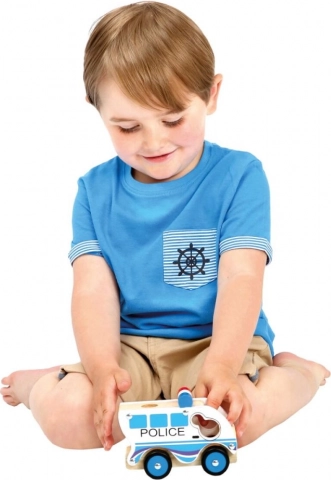 Robusno drveno policijsko autić Bino razveselit će sve male čuvare reda. Izrađeno je od kvalitetnog drva i metalnih elemenata, ima glatke rubove, lako se drži i potiče razvoj mašte, finu motoriku i igre uloga. Odlično upotpunjuje kolekciju s vatrogasnim i ambulantnim vozilom iz iste serije.