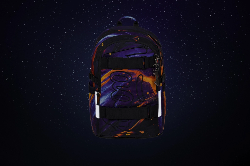 Školski set Baagl Skate Vibe donosi sve što učenici i studenti trebaju svaki dan: od ergonomskog ruksaka s reflektirajućim elementima i premium YKK patentnim zatvaračima, preko pernice s dvostrukim preklopom, do lagane sklopive torbe, torbice za struk i praktičnog organizatora/navlake. Moderan dizajn s izraženim uzorkom u nijansama ljubičaste, plave i narančaste istaknut će se u školi i na putovanjima.