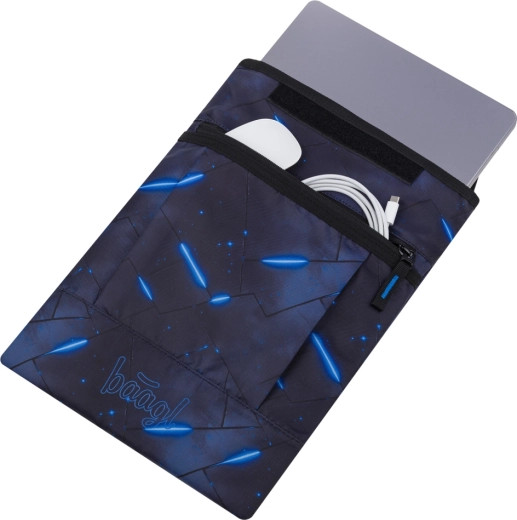 Zahvaljujući mogućnosti odabira među brojnim motivima, lako ćete uskladiti navlaku s ostalom BAAGL opremom. Prednji džep prima punjač, miš ili kabele, tako da je sve praktično pri ruci. Materijal ispunjava Global Recycled Standard (GRS), što potvrđuje njegovu održivost i odgovornu proizvodnju.