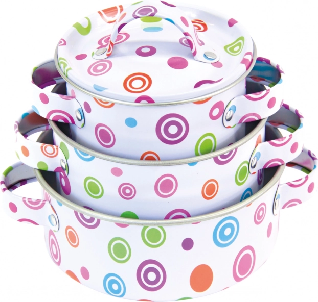 Ovaj kvalitetan set emajliranog posuđa za djecu idealan je za igru kuhara i malih domaćica. Metalni lonci, tava i pribor djeluju autentično, pa će djeca uživati u realističnom kuhanju i posluživanju. Šarene točkice na bijeloj podlozi daju cijelom setu veseo izgled koji će oživjeti svaki dječji kutak.