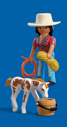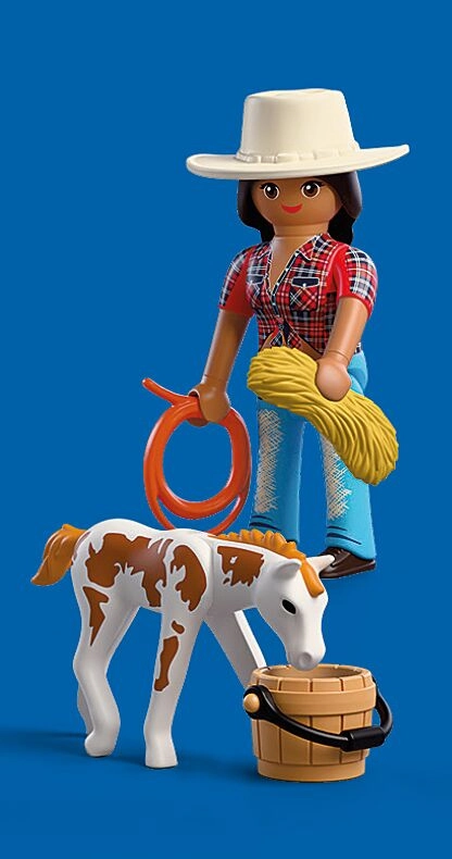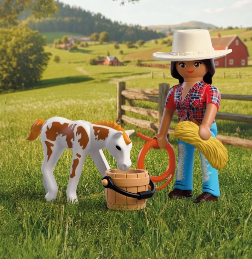 Sadržaj pakiranja uključuje figuru jahačice (cca 7,5 cm), ždrijebe, laso, kaubojski šešir, kantu za vodu i bala sijena. Set se može kombinirati s drugim PLAYMOBIL setovima, što proširuje mogućnosti igre i potiče dugotrajnu zabavu.