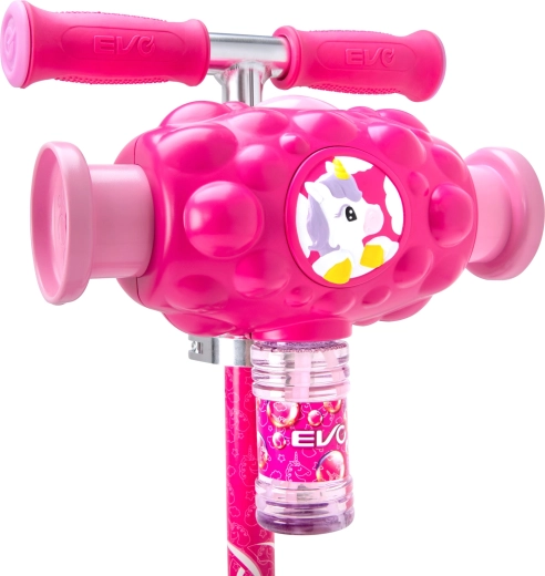 Zabavan i stabilan dječji trotinet EVO Bubblz Mini Cruiser s tri kotača, balansnim upravljanjem i podesivom upravljačkom šipkom. Ugrađeno puhalo za mjehuriće stvara mnoštvo mjehurića tijekom vožnje, što oduševljava djecu. Široka protuklizna podnica, stražnja nožna kočnica i ležajevi ABEC-5 osiguravaju ugodnu i tihu vožnju. Idealno za djecu od 3 godine i za razvoj ravnoteže i koordinacije.