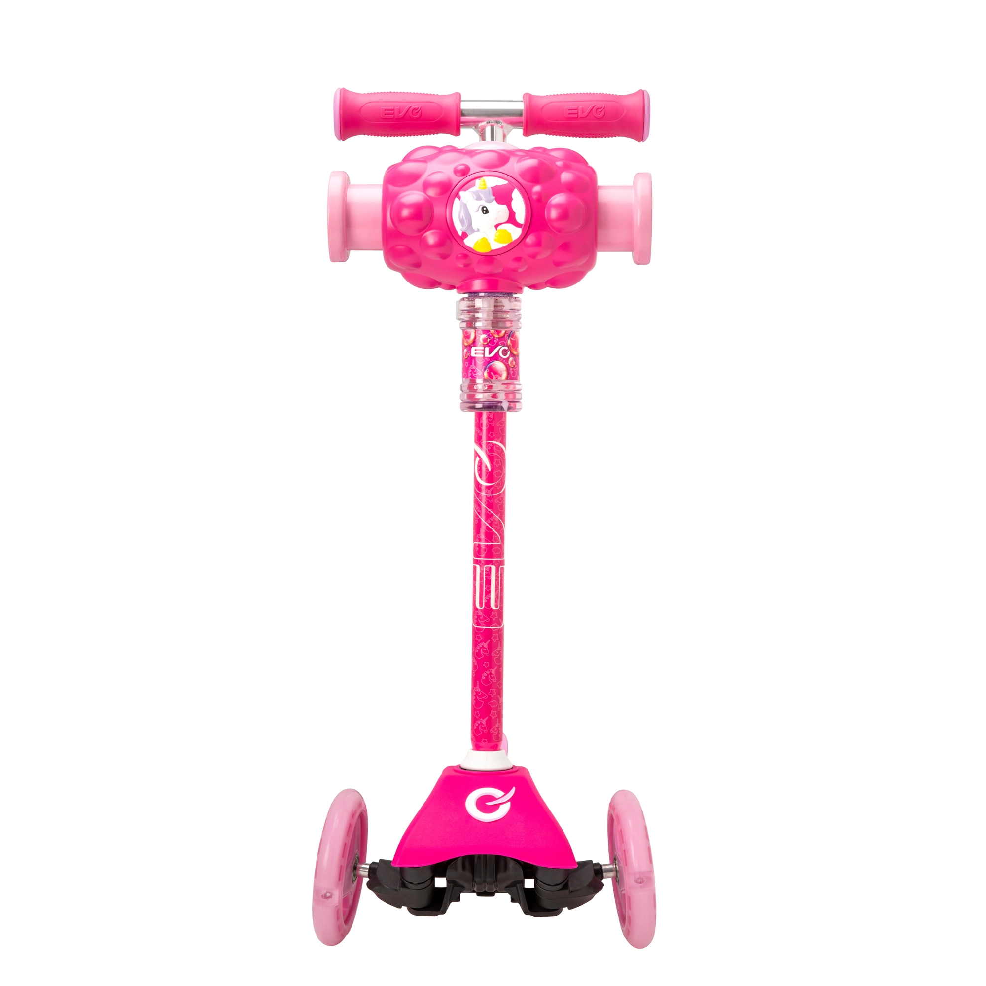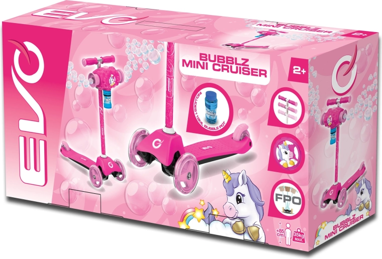 EVO Bubblz Mini Cruiser je razigran i siguran trotinet na tri kotača za najmlađe vozače. Zahvaljujući dva prednja i jednom stražnjem kotaču nudi izvrsnu stabilnost, a balansno upravljanje pomaže djeci prirodno trenirati ravnotežu i koordinaciju. Podesiva visina upravljača omogućuje prilagodbu djetetovoj visini, pa trotinet „rastu” zajedno s njim.