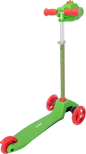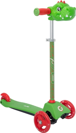 Rast djeteta podupire podesiva visina upravljače (oko 62–72 cm), pa romobil traje nekoliko sezona. LED svjetla u prednjim kotačima dodaju bljeskove boja tijekom vožnje, što djeci pruža zabavu i povećava njihovu vidljivost. Stražnja nožna kočnica ujedno služi kao blatobran i omogućuje brzo, intuitivno zaustavljanje.