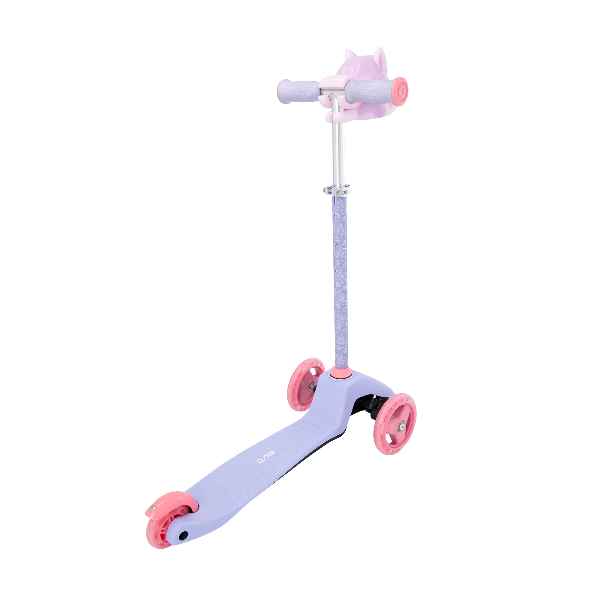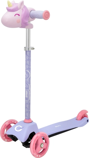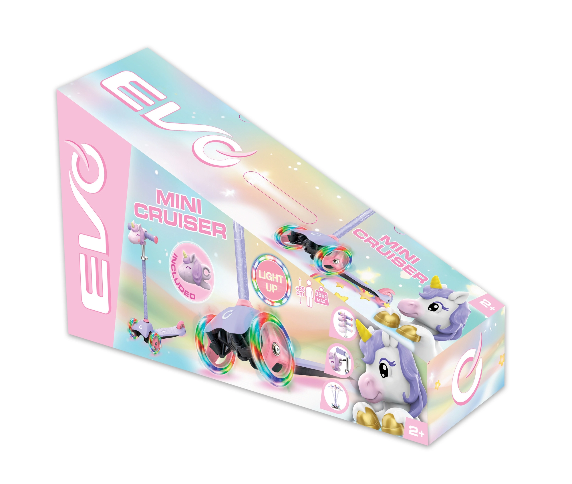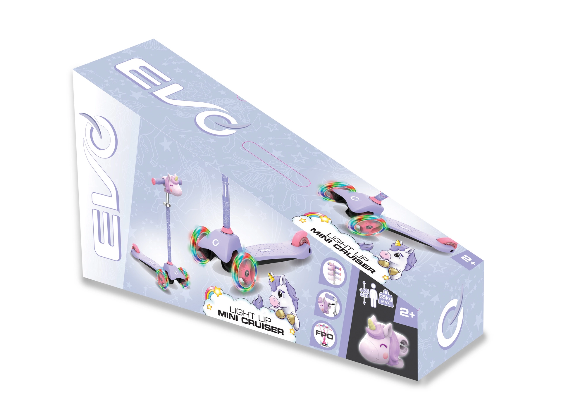 Dječji troskating romobil EVO Light Up Mini Cruiser s motivom jednoroga razveselit će male vozače već od 2 godine. Nudi stabilna tri kotača, široku nisku podnicu, podesiva upravljača i svjetleće prednje kotače za još zabavniju vožnju. Zahvaljujući balansiranom upravljanju naginjanjem razvija ravnotežu i koordinaciju, dok stražnja nožna kočnica osigurava sigurno zaustavljanje.
