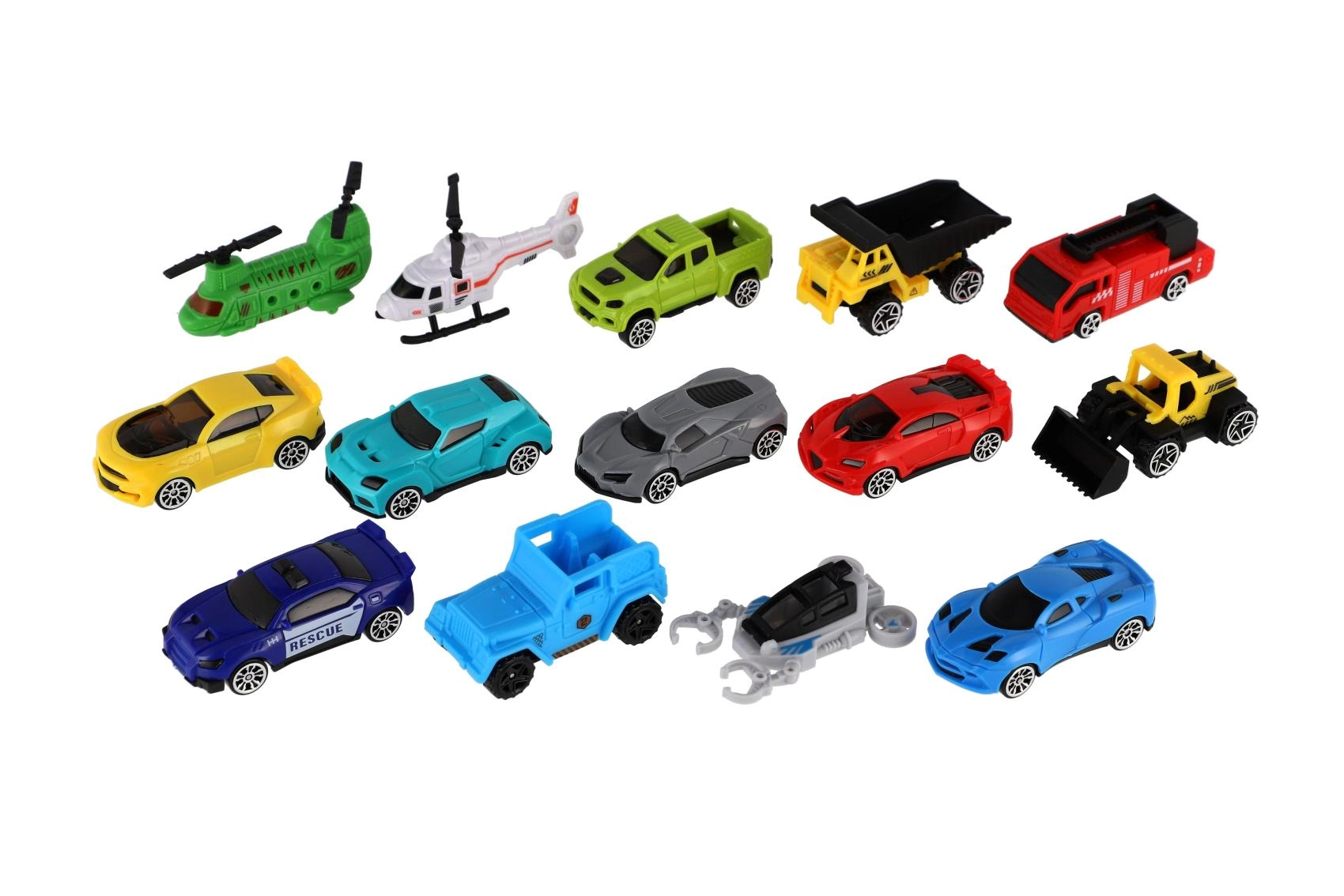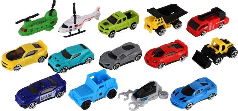 Paket sadrži 14 raznobojnih modela – od sportskih i terenskih vozila preko radnih strojeva do spasilačkih vozila. Preklopna ploča omogućuje brz pristup, kotači kamiona slobodno se okreću, a gornja ručka osigurava udobno prenošenje.