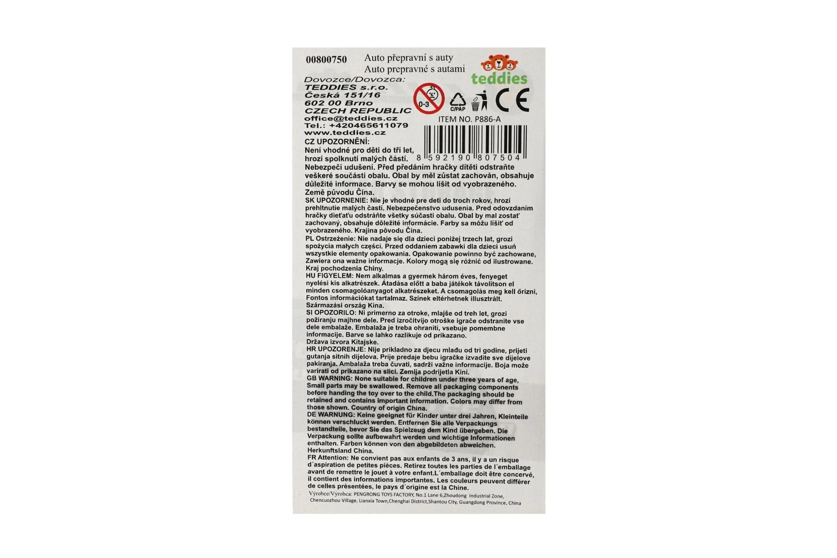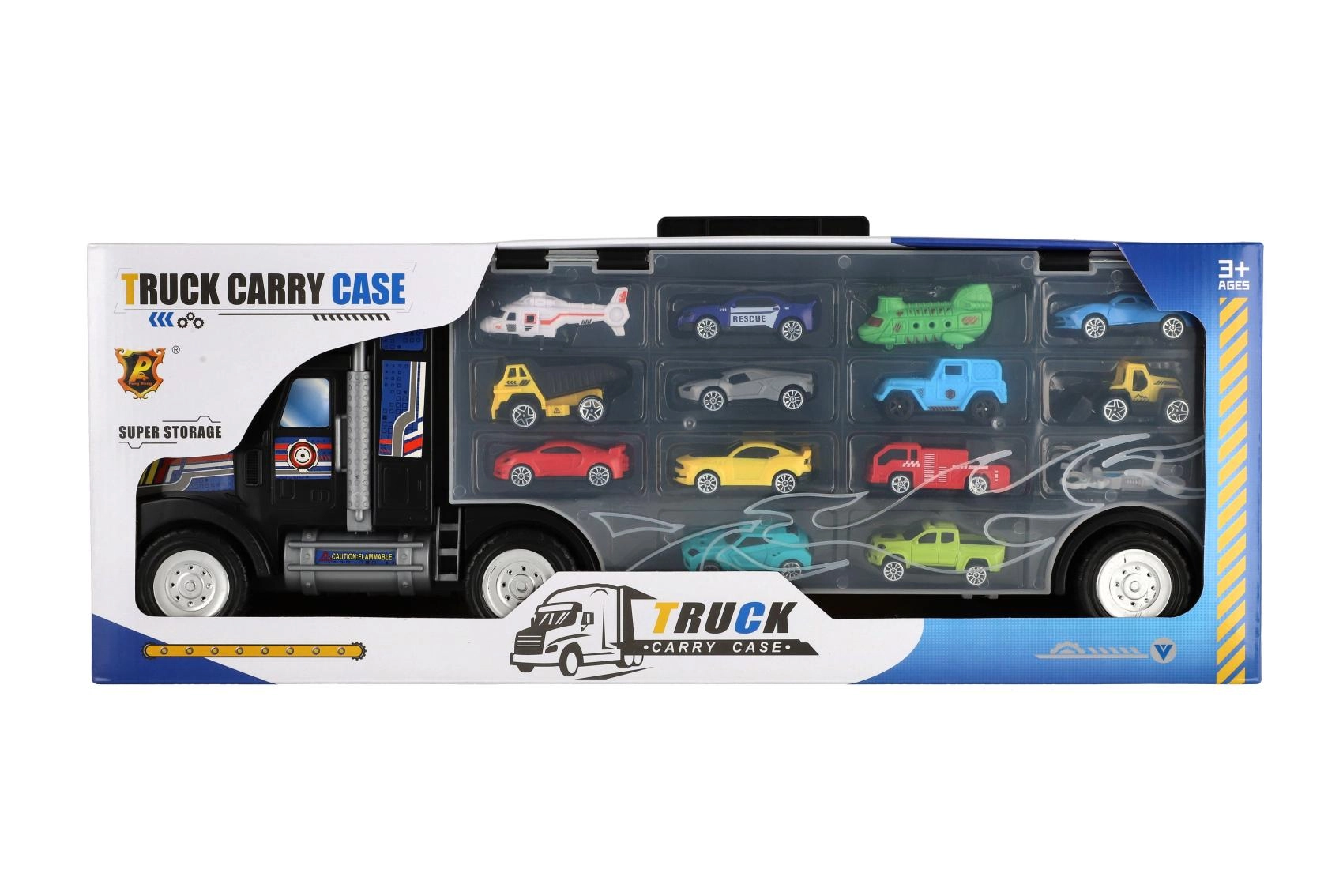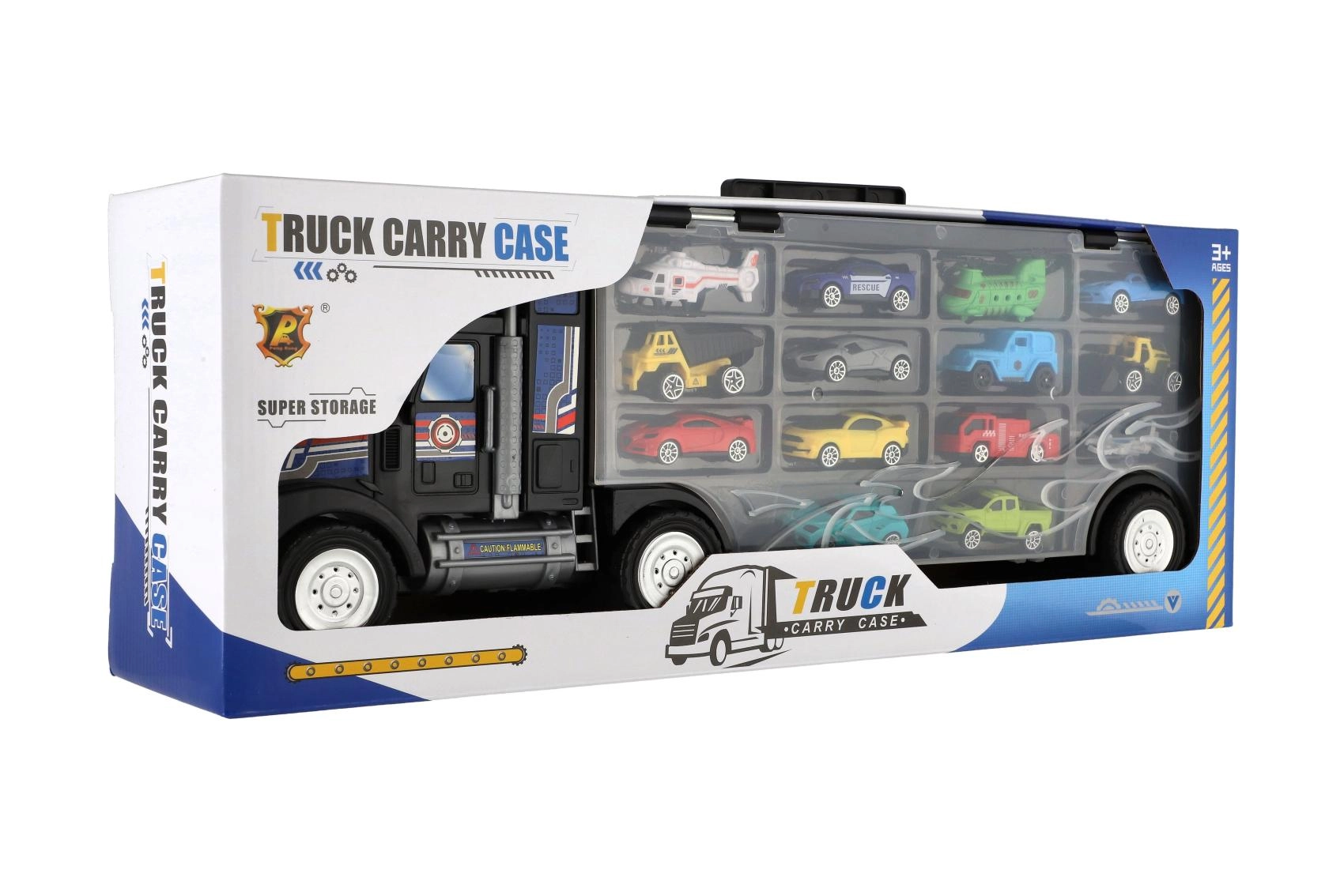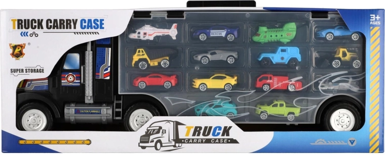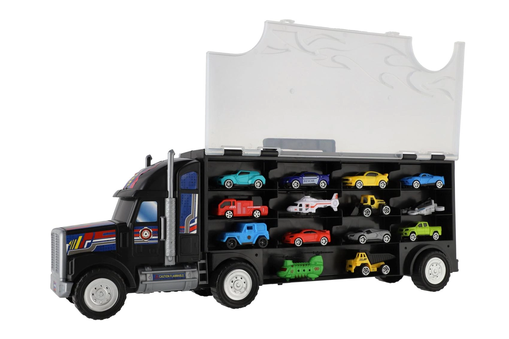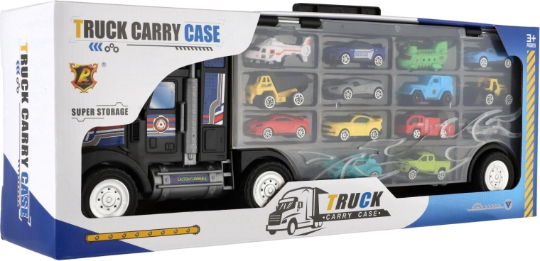 Veliki kamion s prozirnom poluprikolicom služi kao transporter i praktičan kofer za pohranu autića. Unutra se nalazi 14 različitih vozila – sportska, terenska, radna i spasilačka vozila – pregledno posložena iza prozirnih vrataca. Zahvaljujući bočnoj preklopnoj ploči, čvrstoj konstrukciji i ručki, prenošenje i spremanje je jednostavno, a djeca će uživati u satima kreativne igre i razvoja fine motorike.