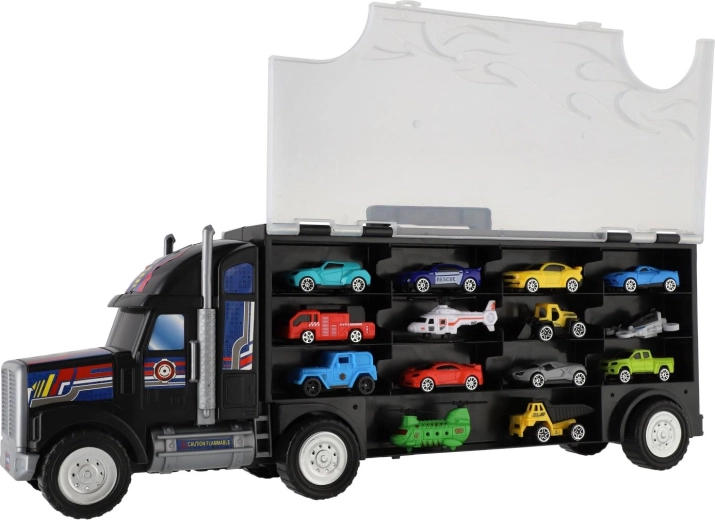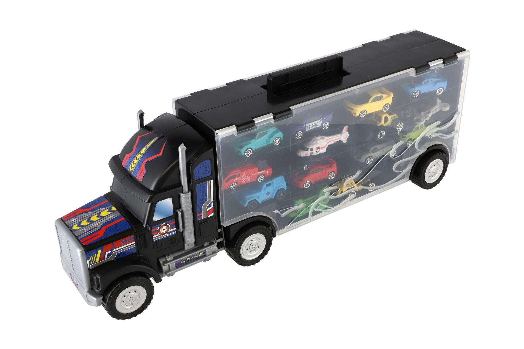 Ogroman crni transportni kamion s prozirnom bočnom stranom odličan je poklon za male ljubitelje automobila. Nudi sigurno odlaganje i laku organizaciju kolekcije zahvaljujući zasebnim pregradama za svaki autić. Tako je dijete uvijek imalo sva vozila pri ruci i spremna za akciju.