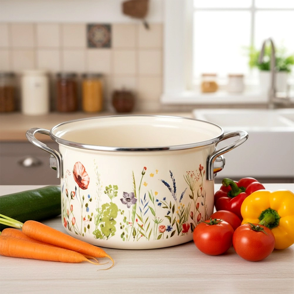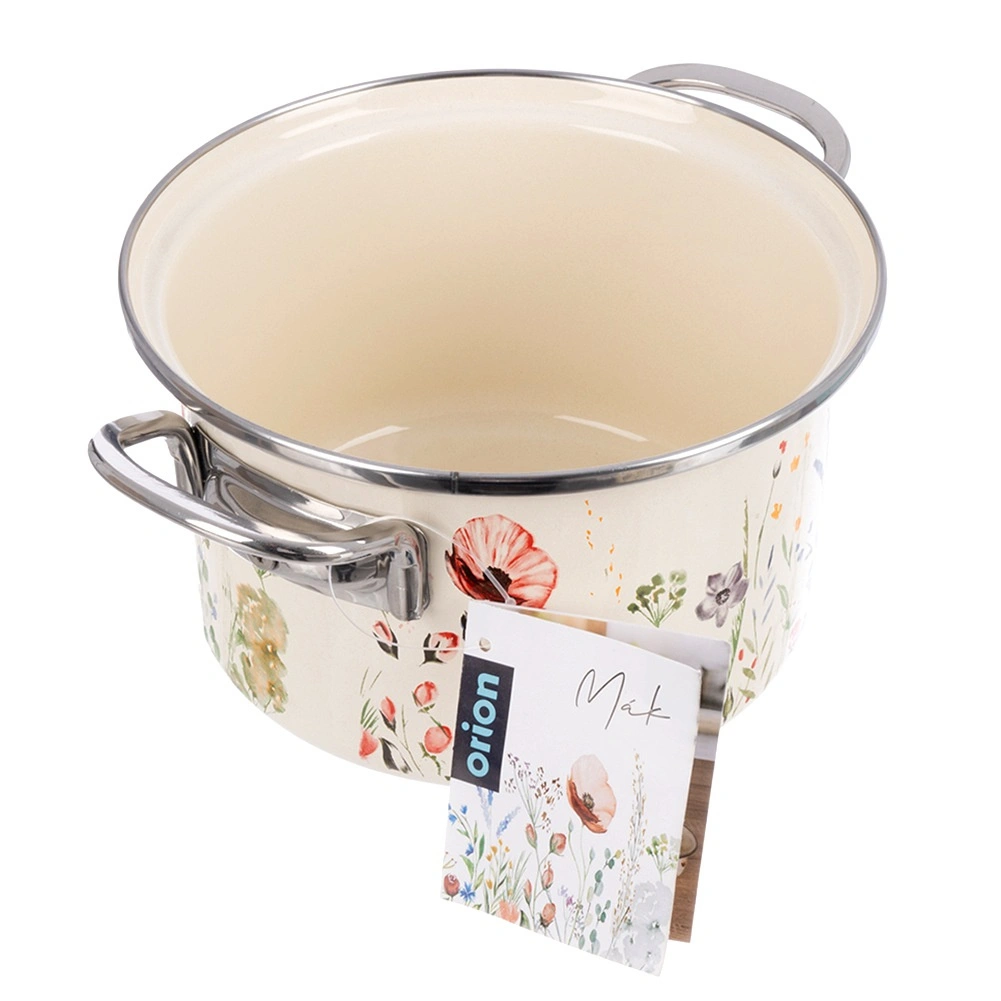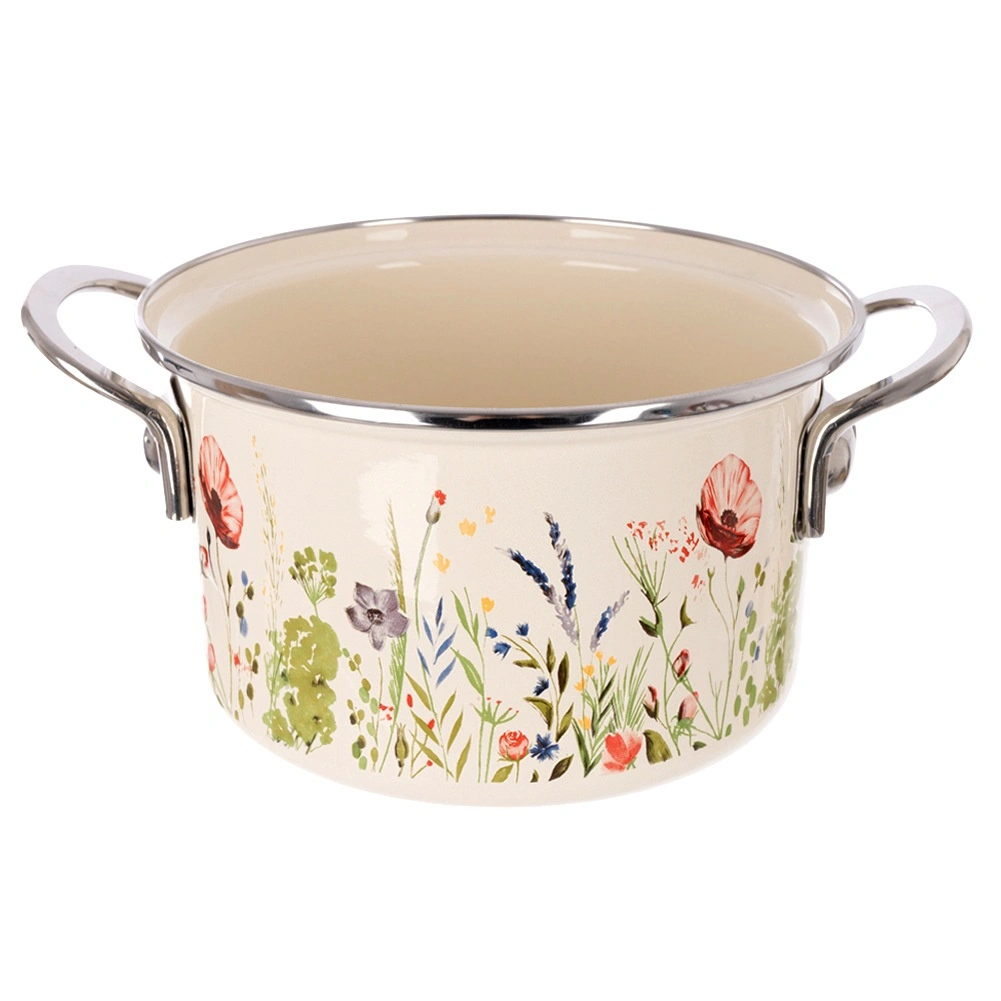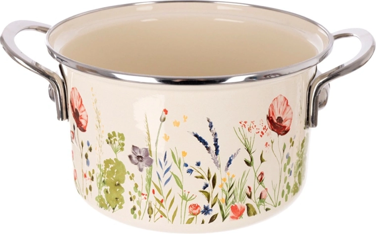 Otkrijte bezvremenski šarm retro dizajna i praktičnost u jednom. Emajlirani lonac u krem boji s motivom livadnog cvijeća postat će ukras svake kuhinje. Zahvaljujući kvalitetnom emajliranom čeliku izvrsno provodi toplinu, izdržljiv je i lako se čisti. Nehrđajući rub i čvrste bočne ručke osiguravaju sigurno rukovanje.