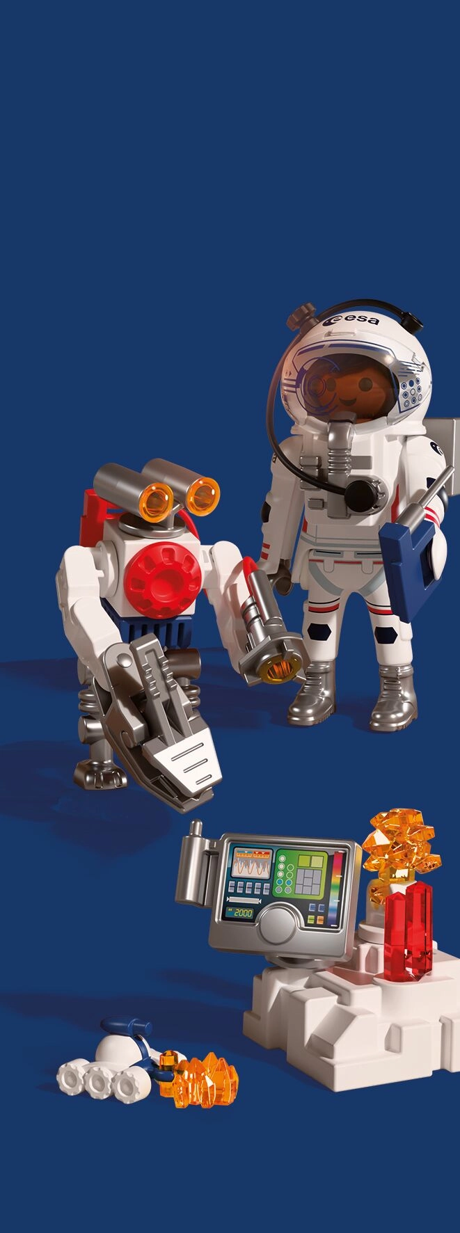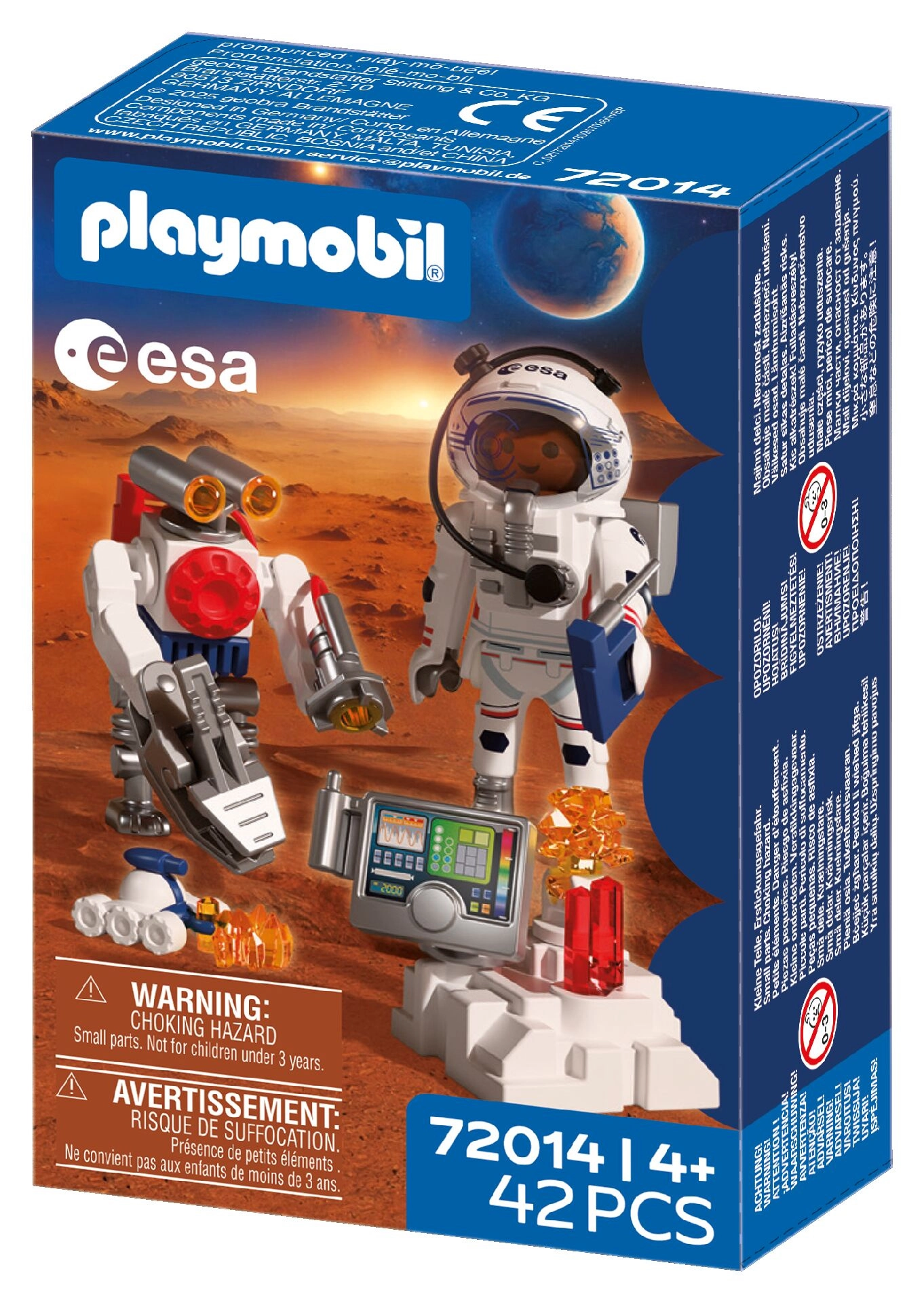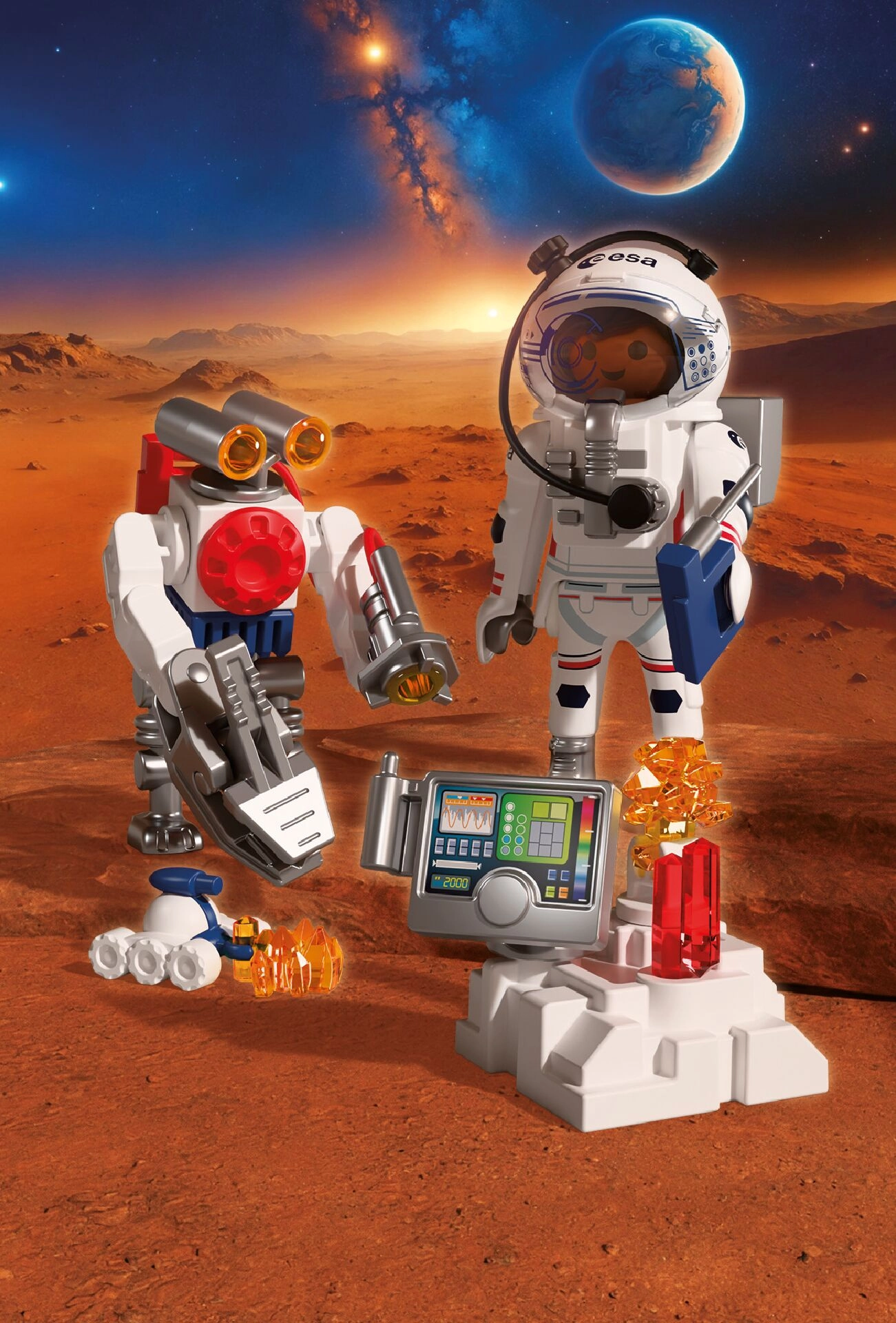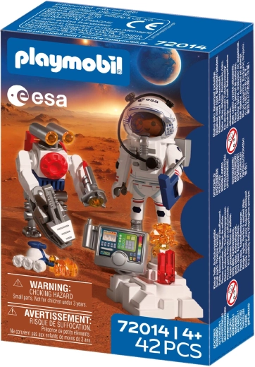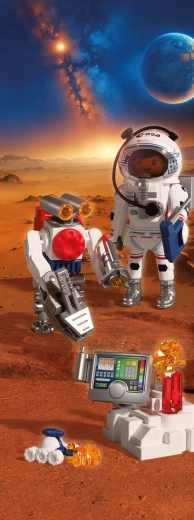 Doživite autentičnu svemirsku avanturu s PLAYMOBIL-om u suradnji s ESA-om. Astronaut uz pomoć okretnog robota i spretnog vozila istražuje površinu crvenog planeta, prikuplja uzorke tla i otkriva tajanstvene signale iz utrobe Marsa. Pokretna, hvataljka ruka robota olakšava podizanje nalaza, dok se vozilo nalik škorpionu probija i do teško dostupnih mjesta.